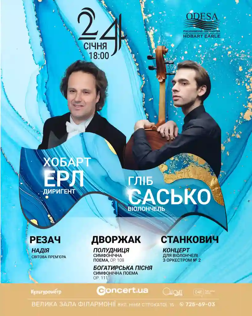 Национальный Одесский филармонический оркестр под руководством Хобарта Эрла представит мировую премьеру произведения Эдуарда Резача «Надежда». В программе также — концерт для виолончели №2 Евгения Станковича и симфонические поэмы Антонина Дворжака. Солист вечера — виолончелист Глеб Сасько.