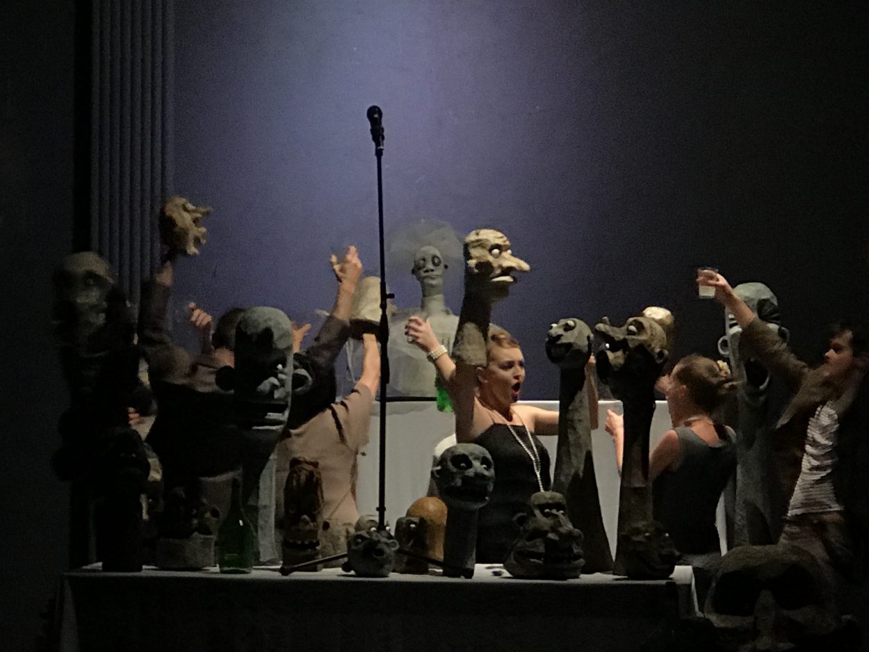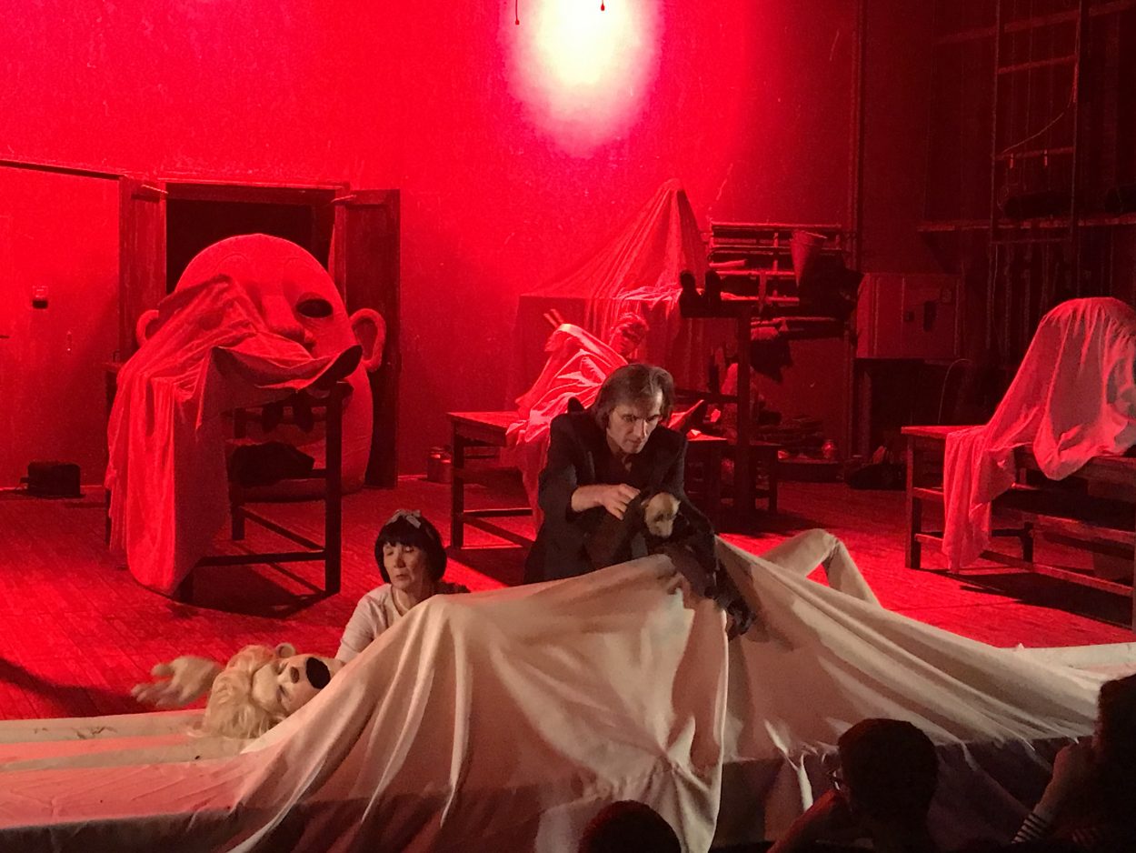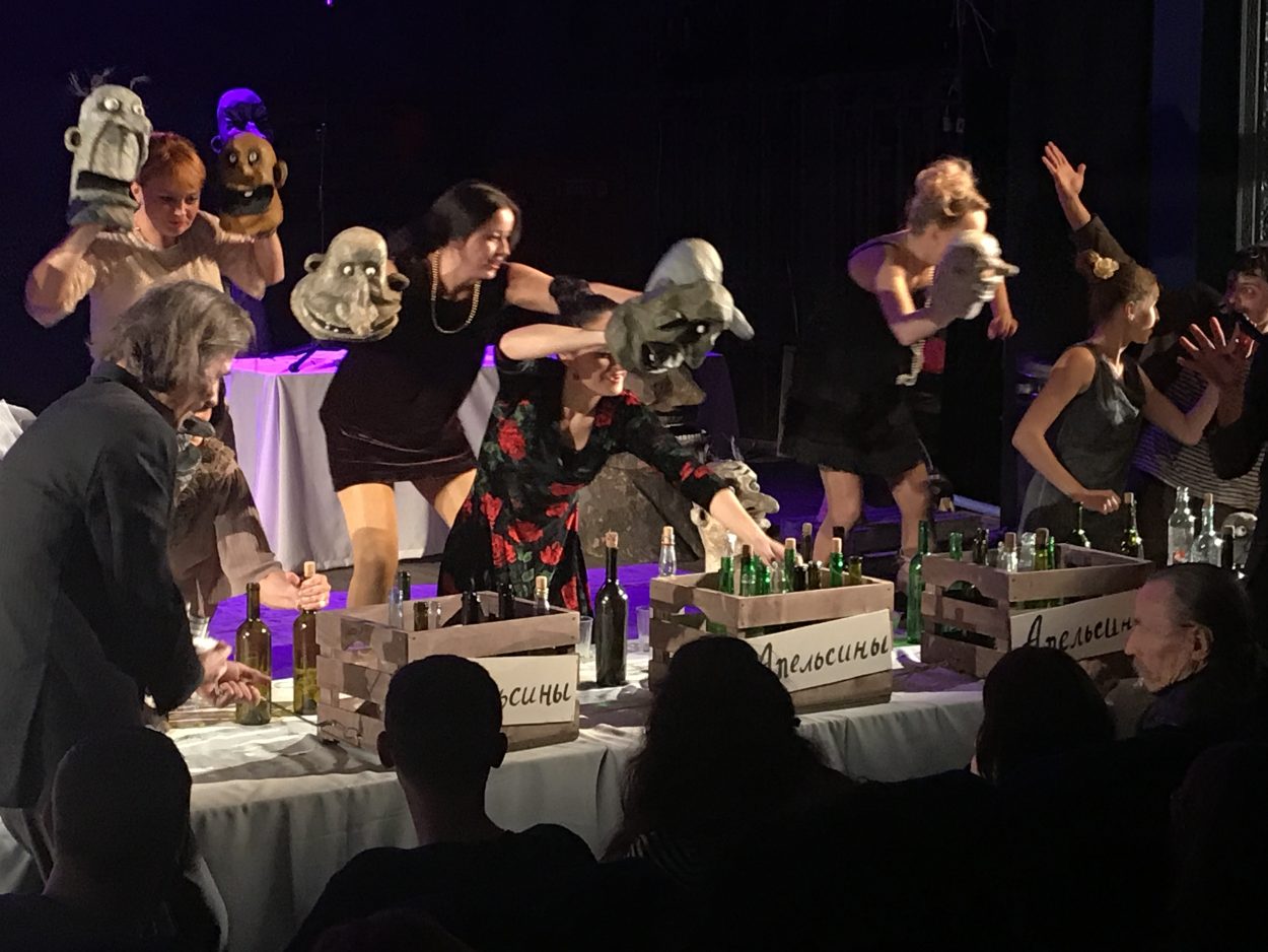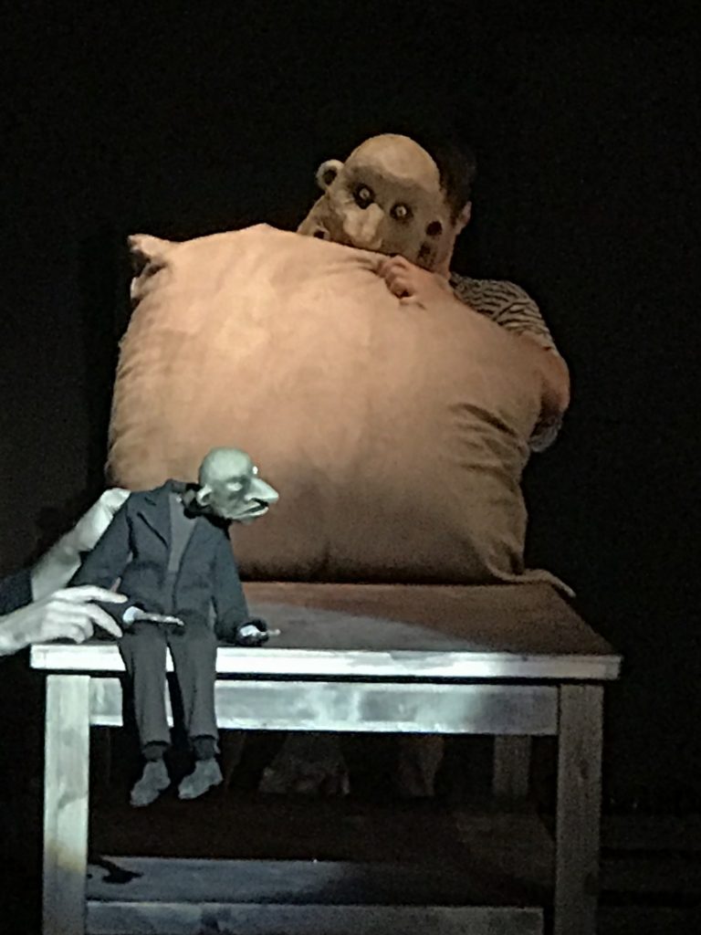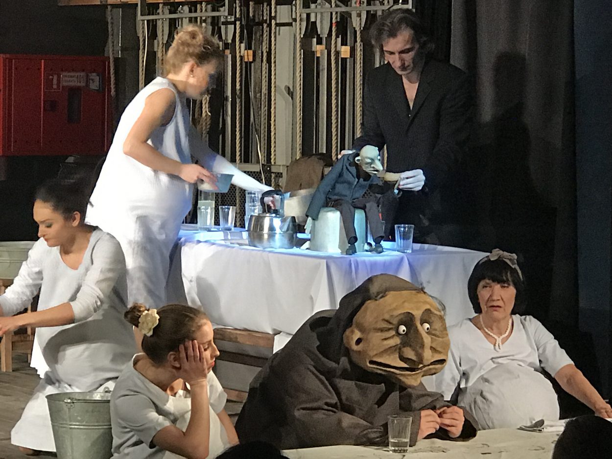 Пересказывать постановку – дело неблагодарное, тем более, что текст Бабеля передан очень точно, и герои уже давно знакомы даже неискушенному зрителю — Беня Крик, Фроим Грач, Любка Козак… А вот какими средствами это было сделано, пожалуй, рассказать стоит. Первое, что бросается в глаза, вернее, в уши – отсутствие “одесского акцента”. И от этого спектакль нисколько не проиграл, а наоборот выиграл – зритель слышит чистый, без кривляний и гипертрофированной одесскости прекрасный текст великолепных произведений. А вот герои на сцене как раз невероятно характерны, объемны, шумны и гиперактивны. Их много – порядка 65 (!!!!) кукол было создано мастерами, от маленьких, в несколько сантиметров до гигантских. 65 неожиданных образов которым “помогали” вжиться в роль десять актеров, ставшие равноправными партнерами по сцене.