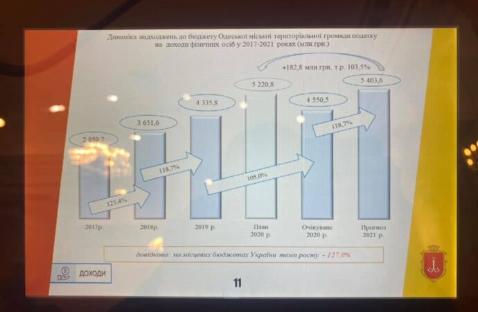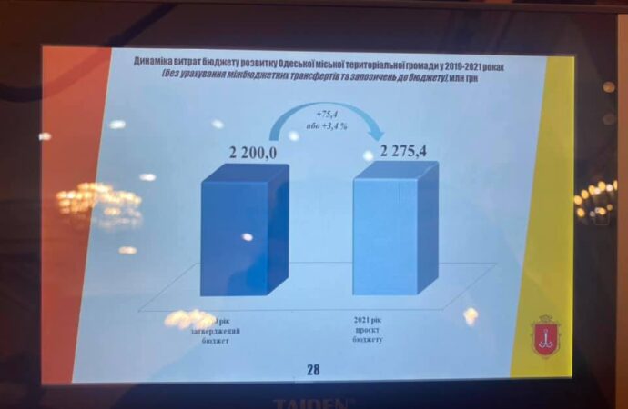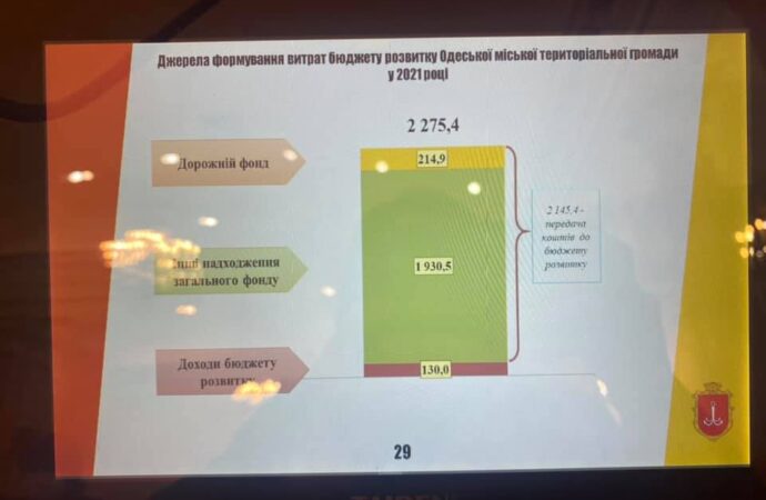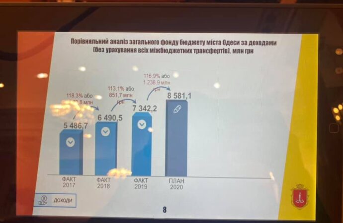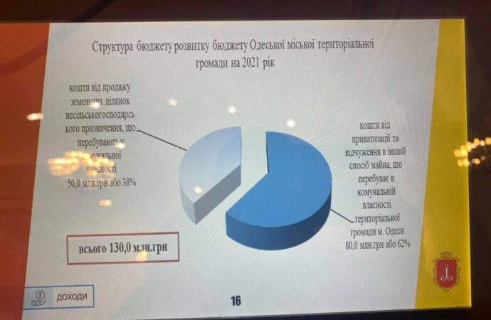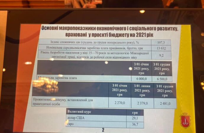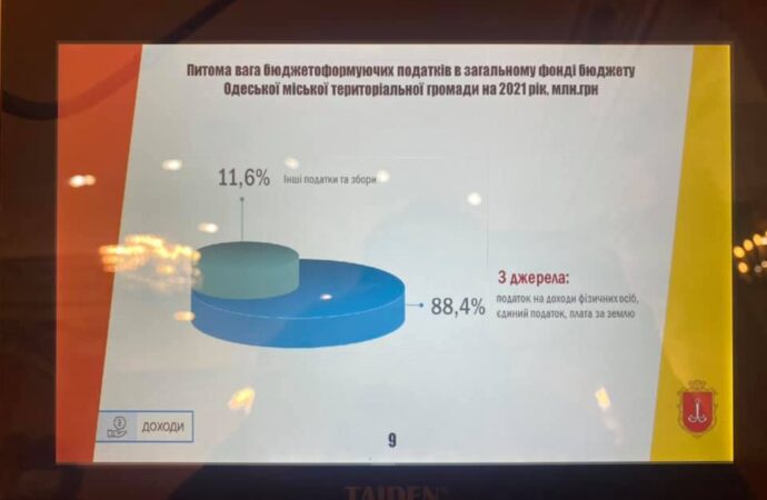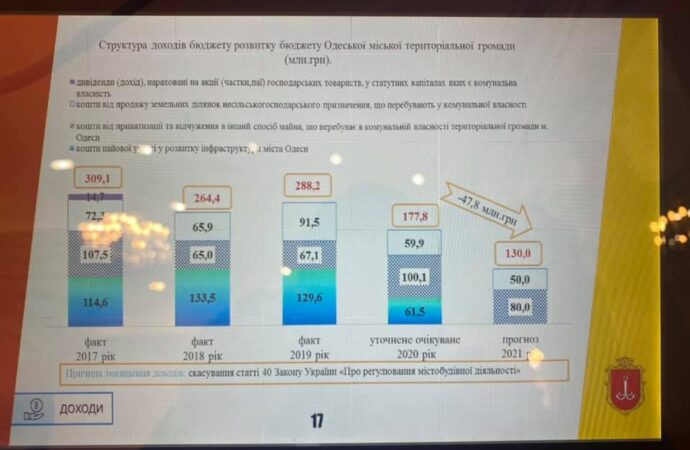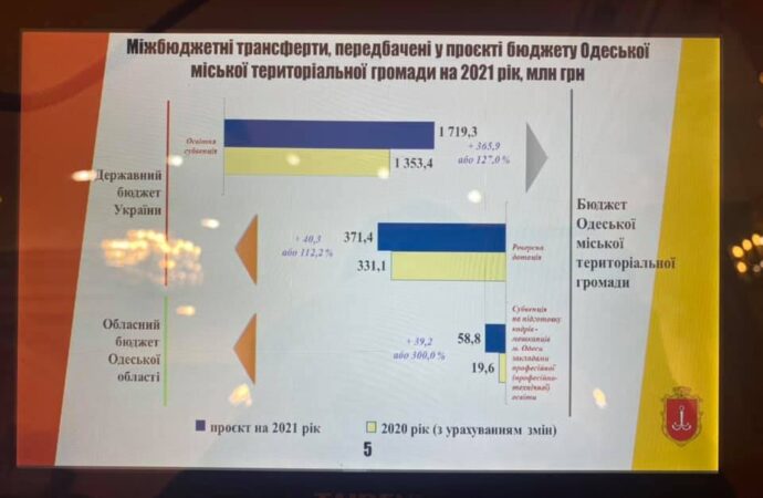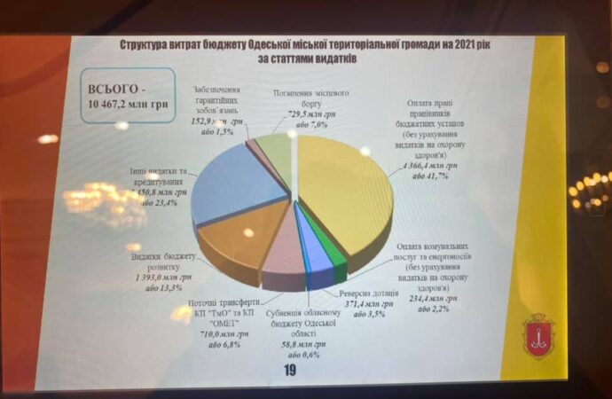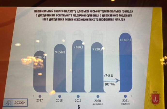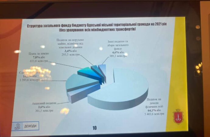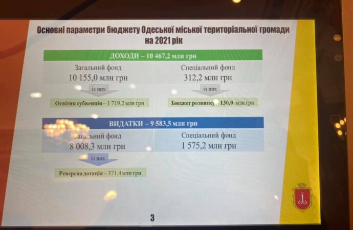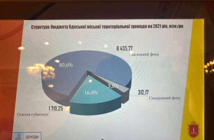 Проект решения о бюджете Одессы предусматривает, что доходы бюджета в 2021 году составят 10 миллиардов 467 млн грн (общий фонд — 10 млрд 155 млн, специальный — 312,2 млн грн (в т.ч. бюджет развития 130 млн грн).