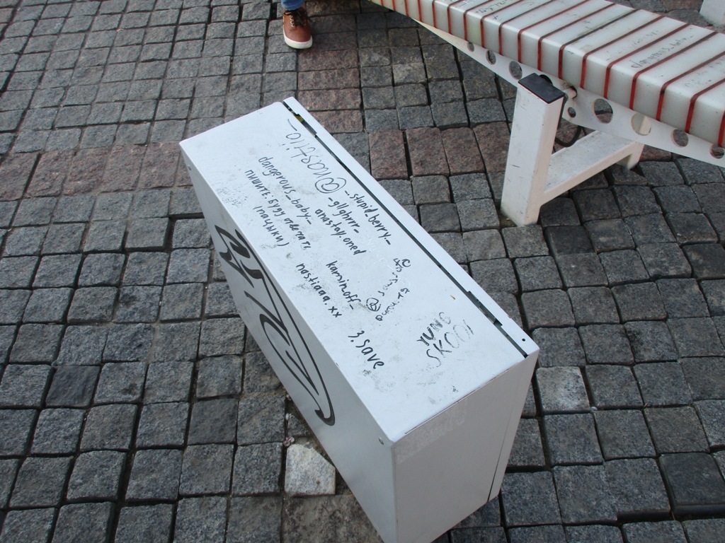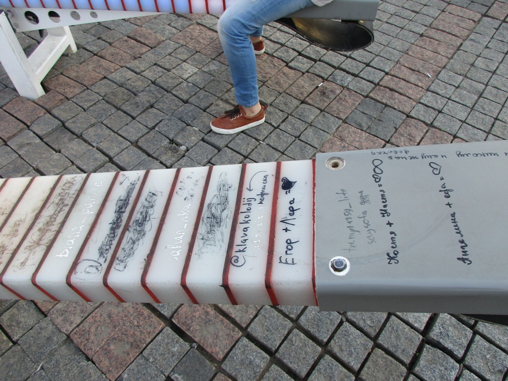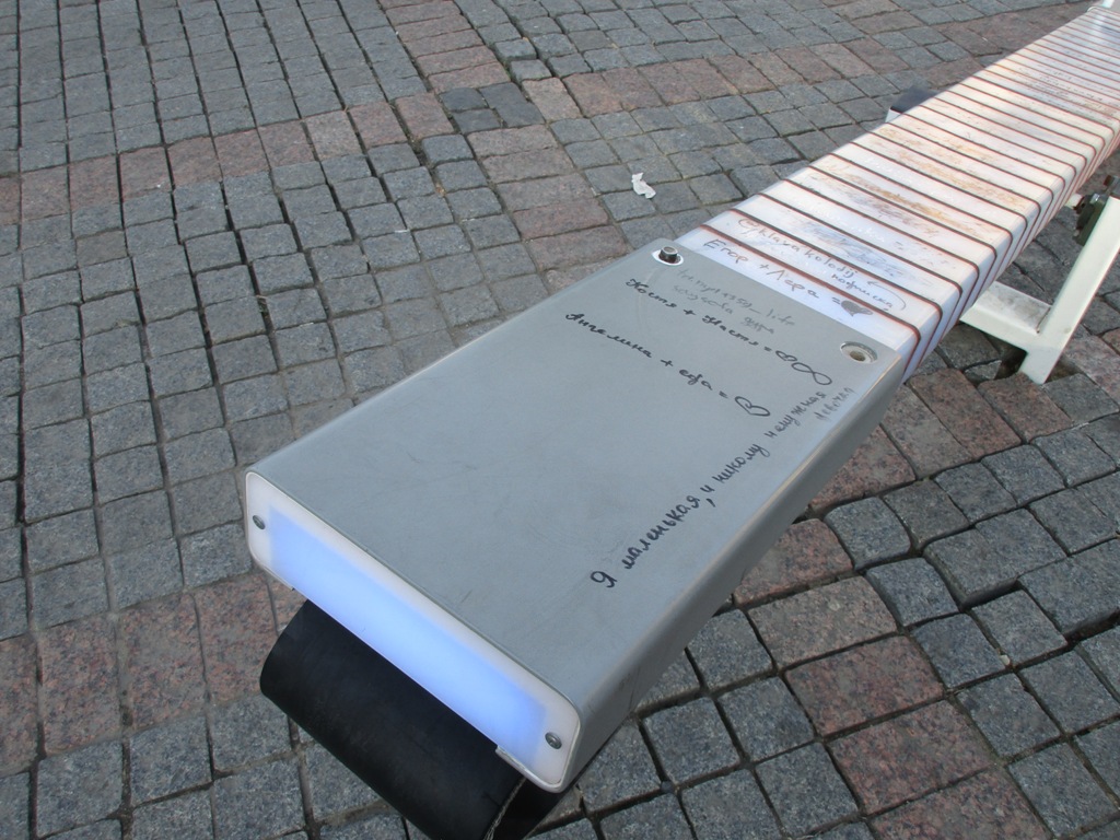 А что же с качелями происходит теперь? Прошло пять месяцев после их установки. Мы подошли к объекту поближе: качели пользуются большим спросом у детей, родители тоже довольны. Вот только эта радость с подсветкой превратилась в «местное СМИ», то есть, по сути, наша гордость теперь исписана со всех сторон. Тут вам и адреса «качелеписателей» в Инстаграмм, и признания в любви и политических пристрастиях, и самая обыкновенная похабщина.