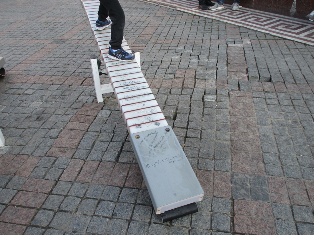 Не успели их установить, как качели стали активно ломаться. Причем, именно те (4 штучки), которые установлены на Греческой площади. К примеру, в парке Шевченко они как новенькие. Вероятно, потому, что рядом находится спортивный комплекс, и он охраняется. А вот на Греческой площади, совсем скоро после установки, это «новое уникальное световая и интерактивная локация» стала терять первые ручки — те самые, за которые держатся дети во время катания на качелях.