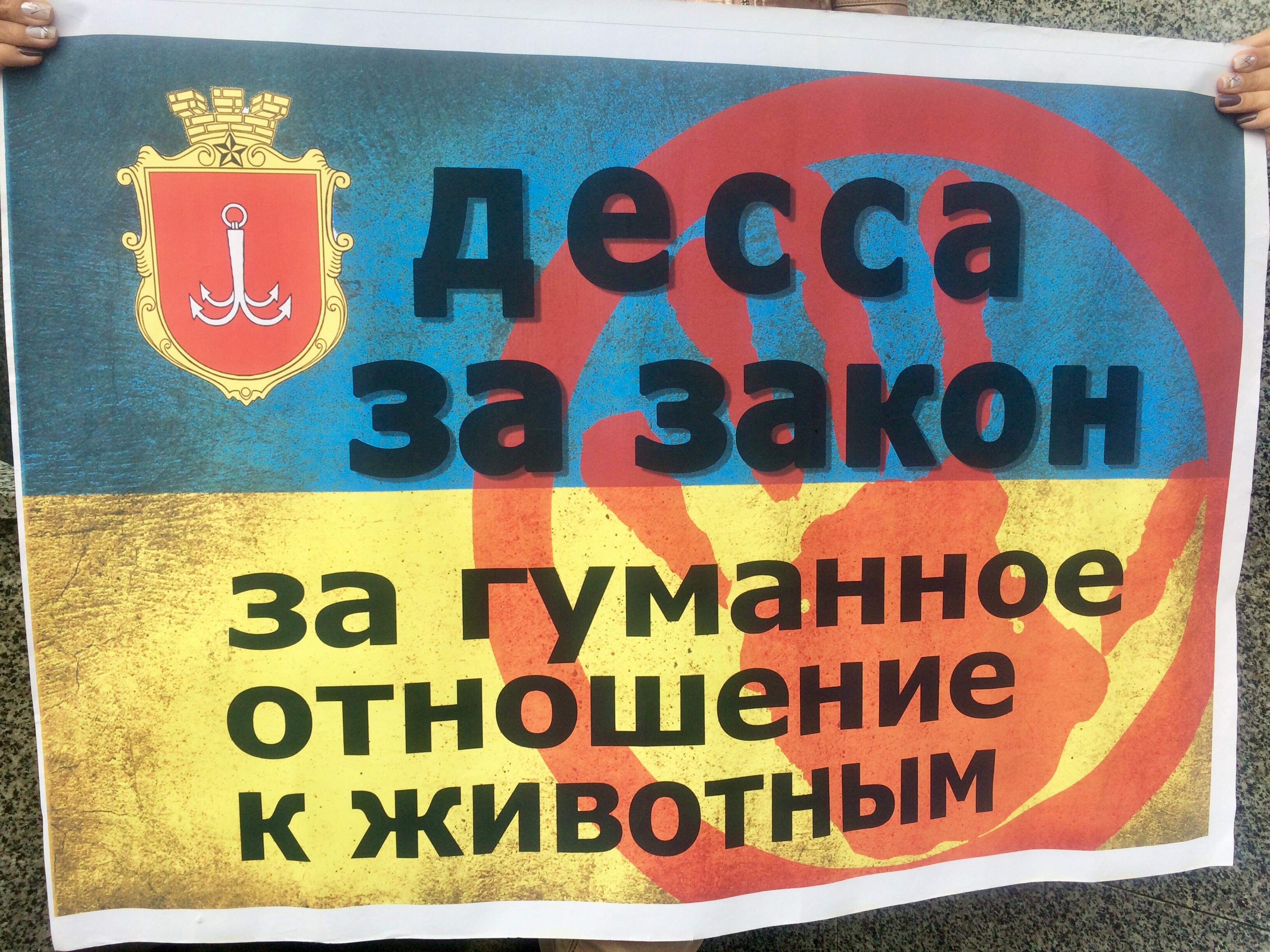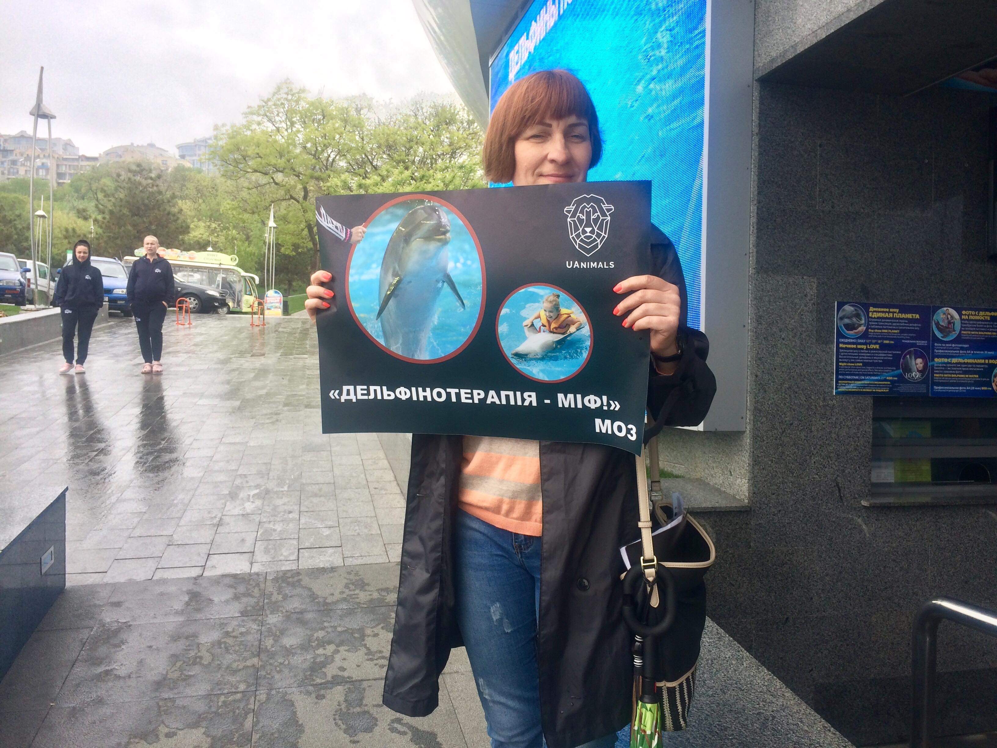 Сегодня возле Одесского дельфинария собралось около десяти людей с плакатами. Их целью было привлечь внимание посетителей и прохожих к жестокому обращению к дельфинам. По их словам, дельфинов сначала отделили от стаи и семьи, а теперь заставляют голодать, чтобы они выполняли трюки.