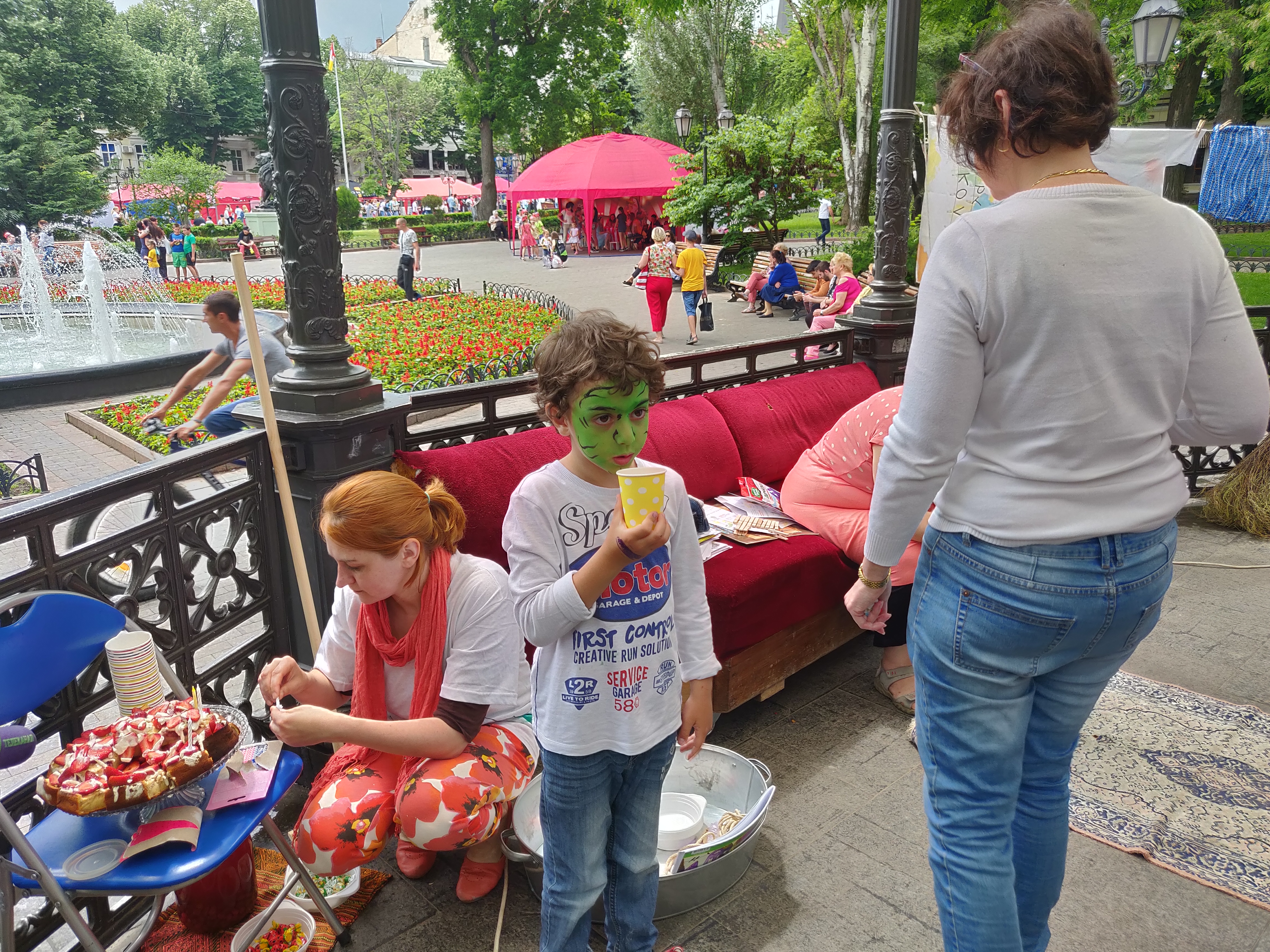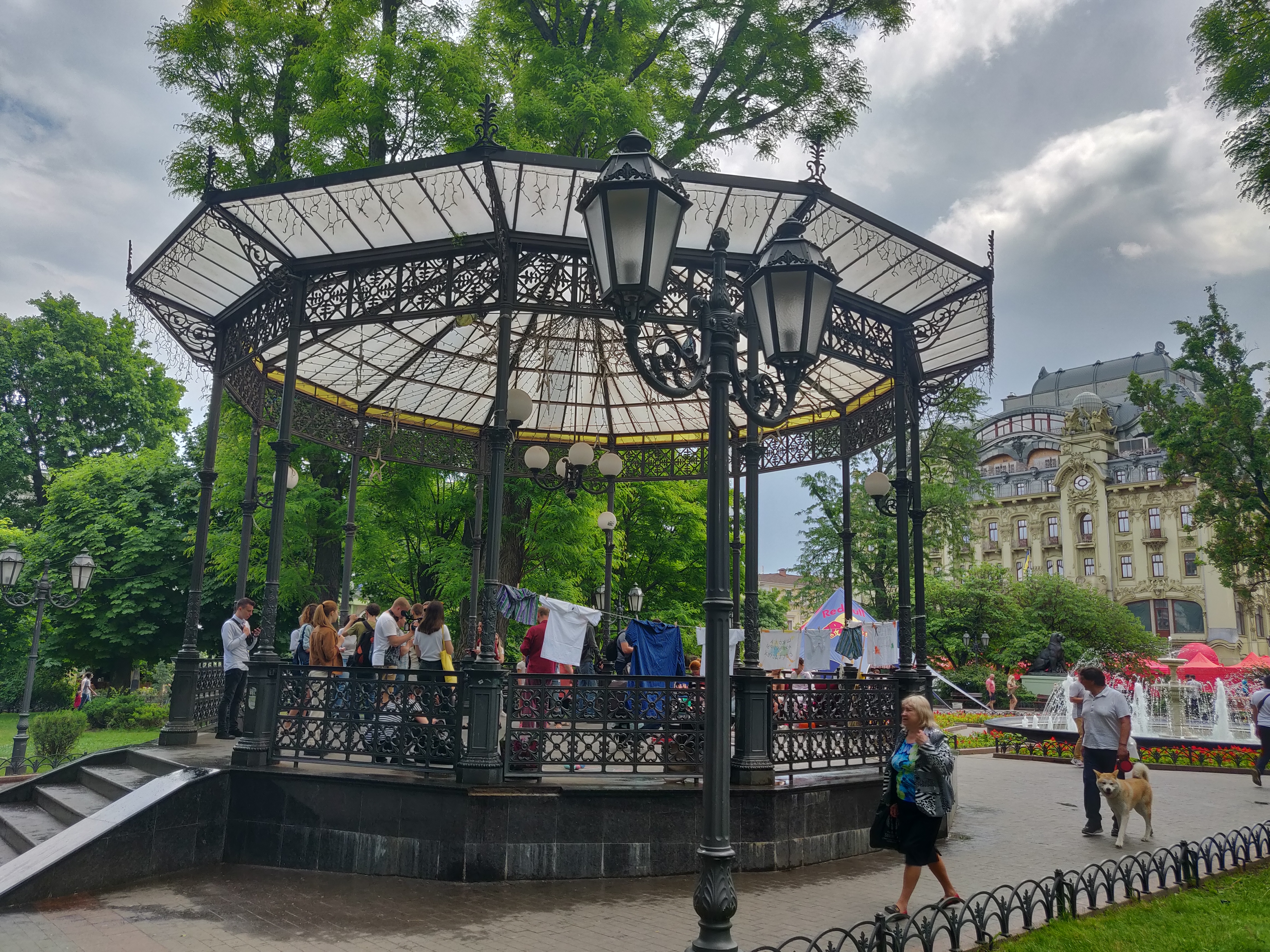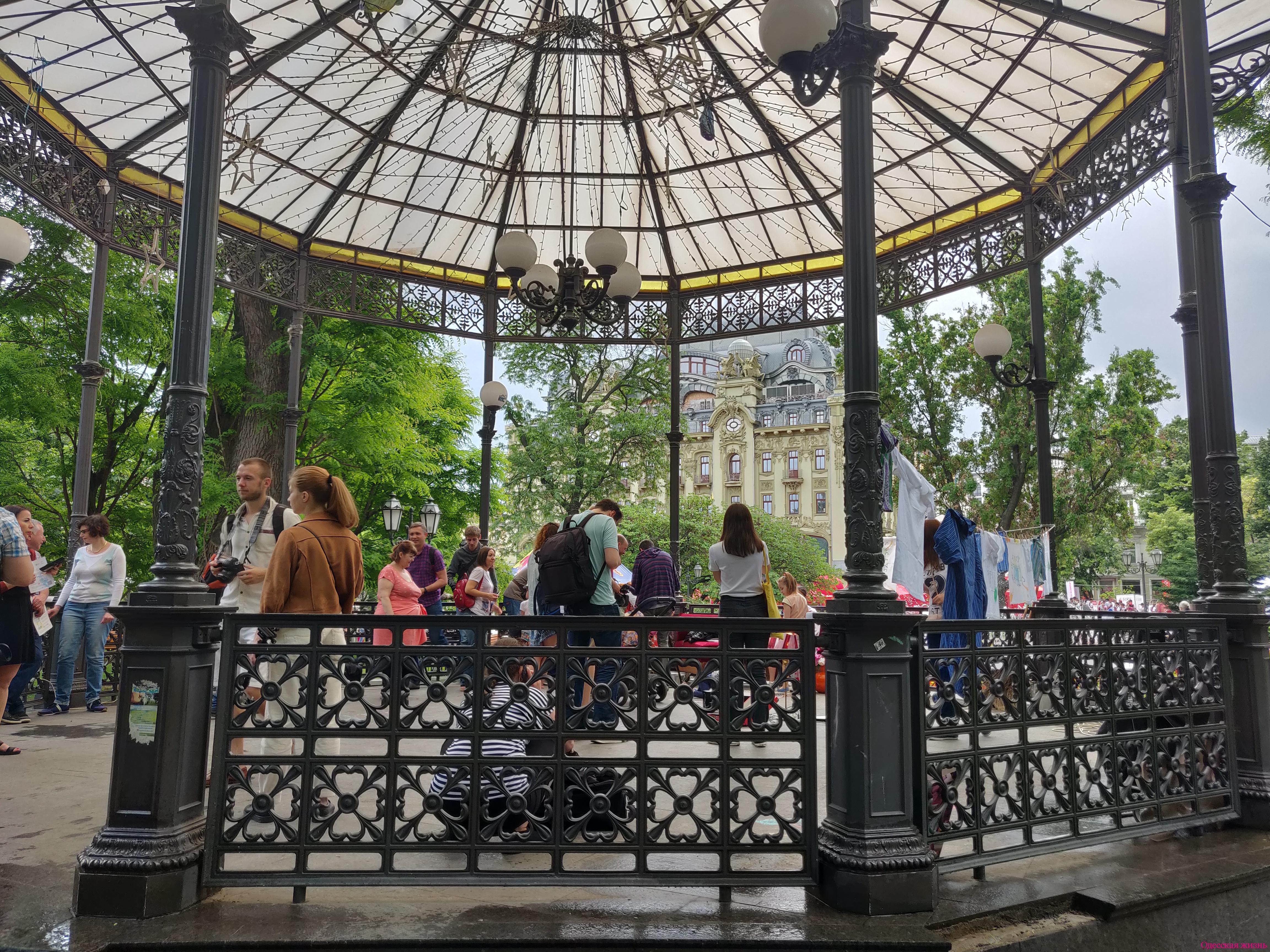 Специально для праздника в ротонде Горсада оборудовали импровизированный одесский двор с его обязательными атрибутами: диван, дети, бабушки, рисунки на асфальте, домашняя одежда и тапочки и, конечно, веревки, на которых сушится белье.