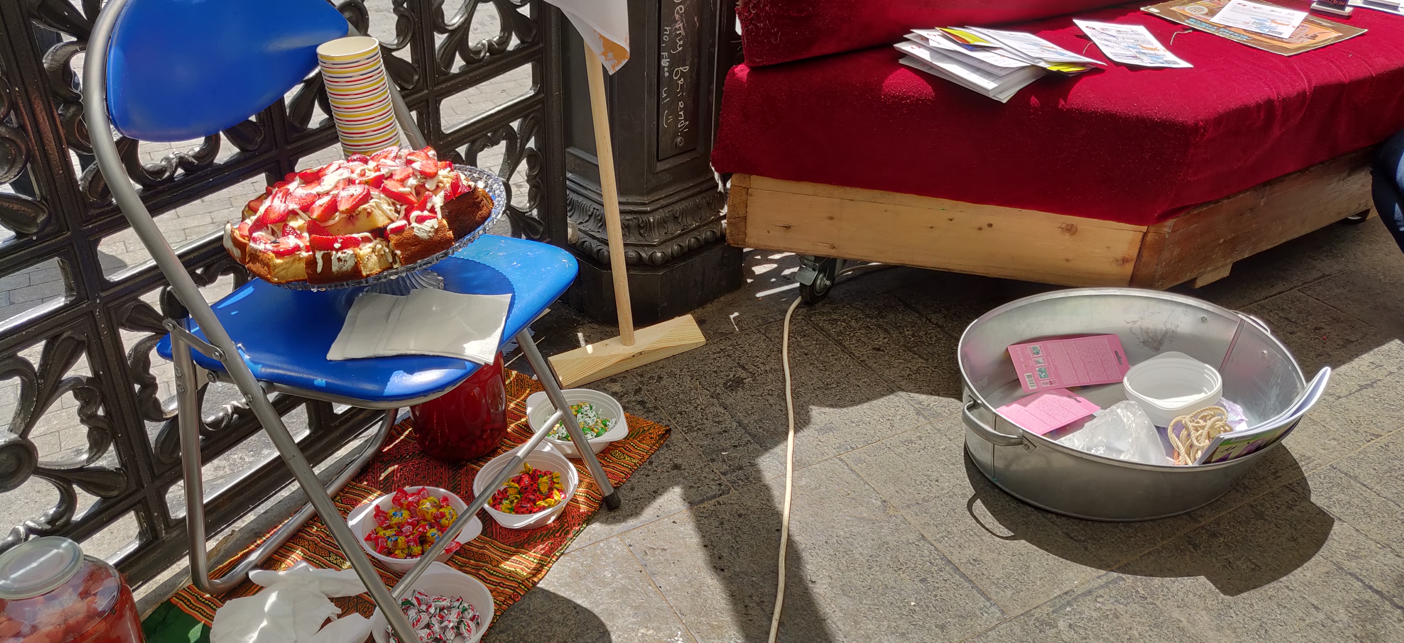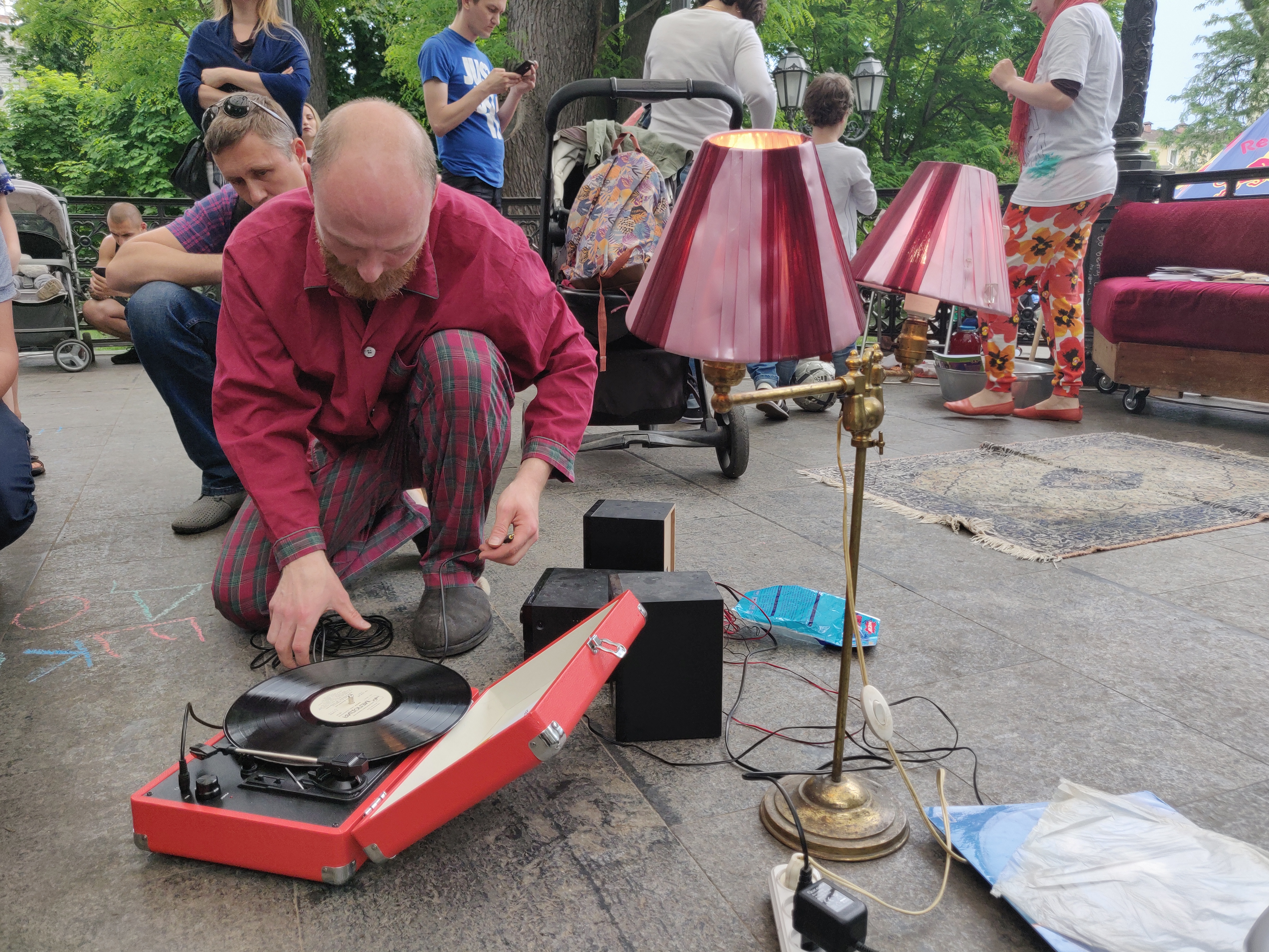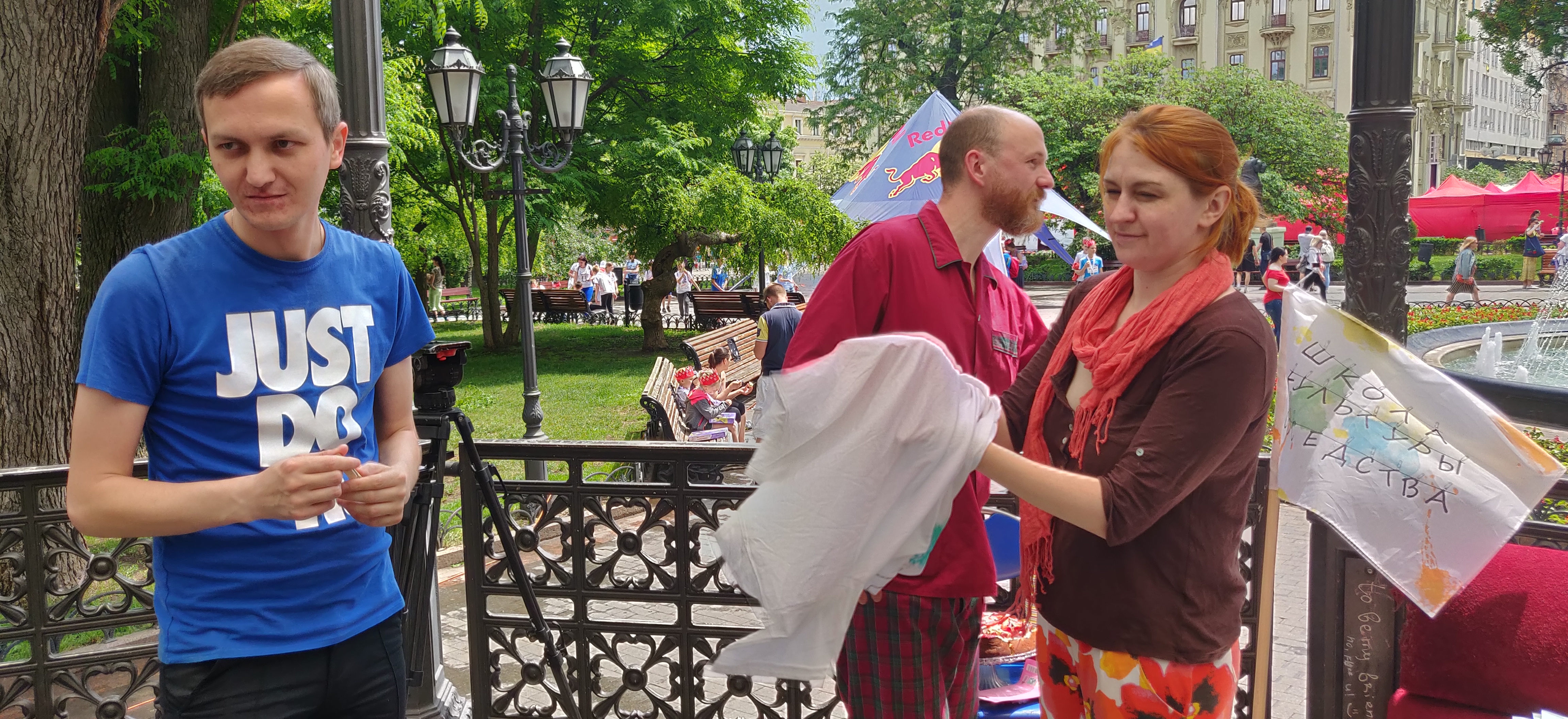 Специально для праздника в ротонде Горсада оборудовали импровизированный одесский двор с его обязательными атрибутами: диван, дети, бабушки, рисунки на асфальте, домашняя одежда и тапочки и, конечно, веревки, на которых сушится белье.