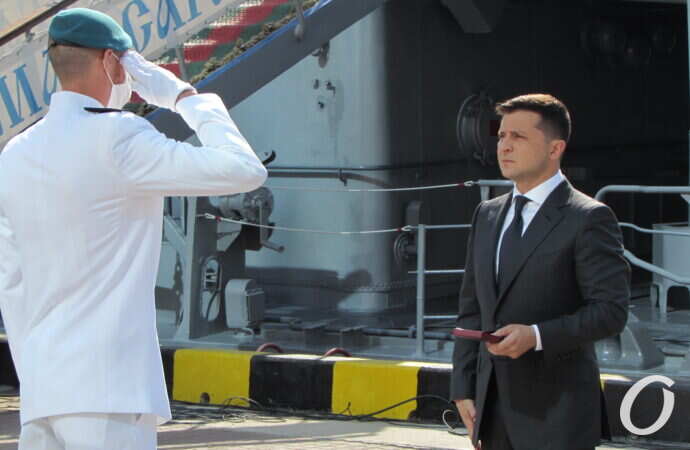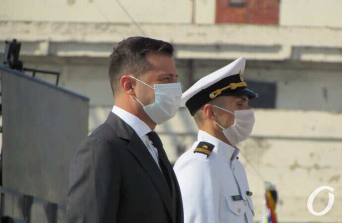 Журналисты же ожидали президента с 8 утра. Но, по «профессиональной традиции» наших президентов, пришлось подождать час. Гарант конституции появился около 9-00. Моряки, вспотевшие от долго пребывания на солнце, отдали ему воинское приветствие. Затем Зеленский занял место за стойкой с микрофонами.