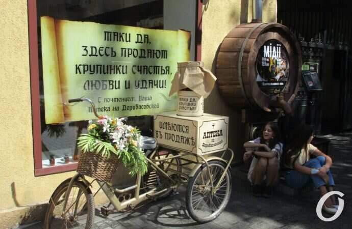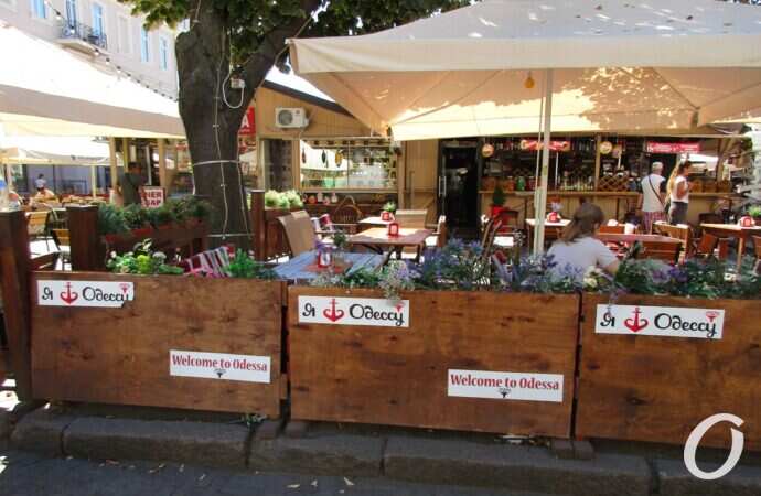 Признаний родному городу с предстоящим днем рождения на Дерибасовской не наблюдается. Ну разве что одна кафешка на улице «обклеилась» сердечными штучками в адрес «мамы».