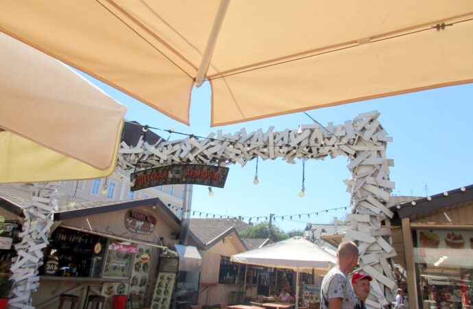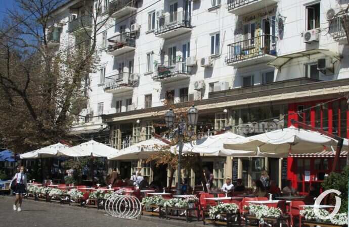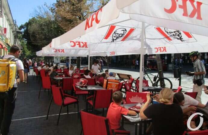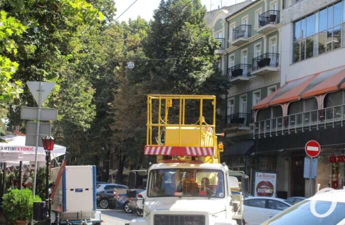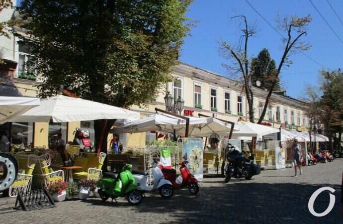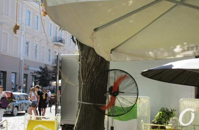 Дерибасовскую чистят-моют ко Дню города, спецтехника лавирует между все теми же электромобилями, как прохожие — между столиками. Кафешно-ресторанная идиллия на главной улице — это нечто! Жара? Так практически все места в кафе на улице теперь «оборудованы» вентиляторами!