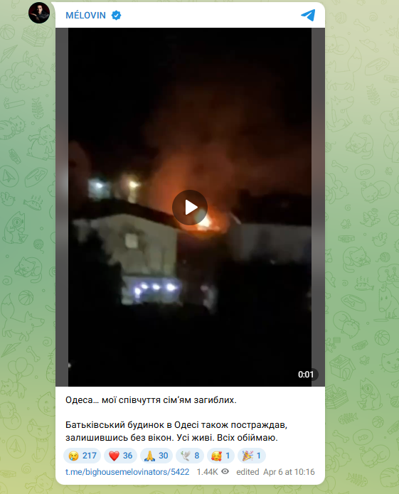 Враг совершил массированную атаку по Одессе 6 апреля. Эта старшая ночь принесла не только разрушение, но и унесла жизни людей. Также в Одессе поврежден жилой дом родителей украинского певца Константина Бочарова, известного как Melovin.