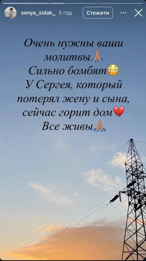 «Очень нужны ваши молитвы. Сильно бомбят. У Сергея, который потерял жену и сына, сейчас горит дом. Все живы», — написала она в соцсетях.
