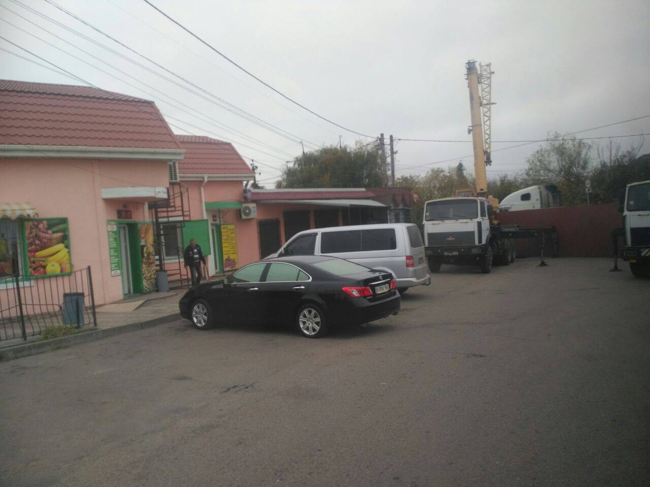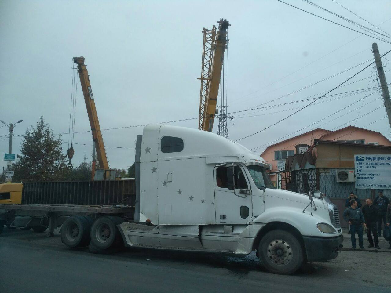 Сейчас там работают два крана, которые поднимают автомобиль. Тягач уже подняли, а контейнер еще «отдыхает».