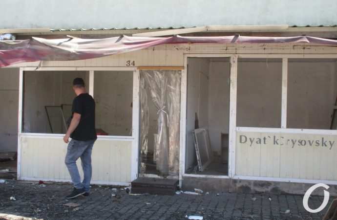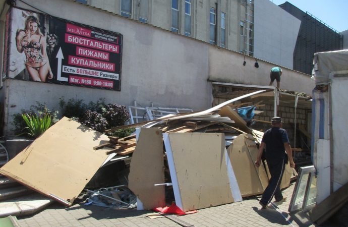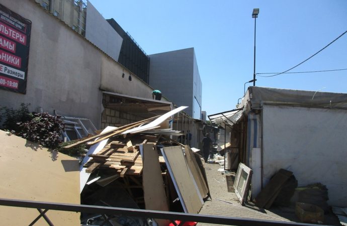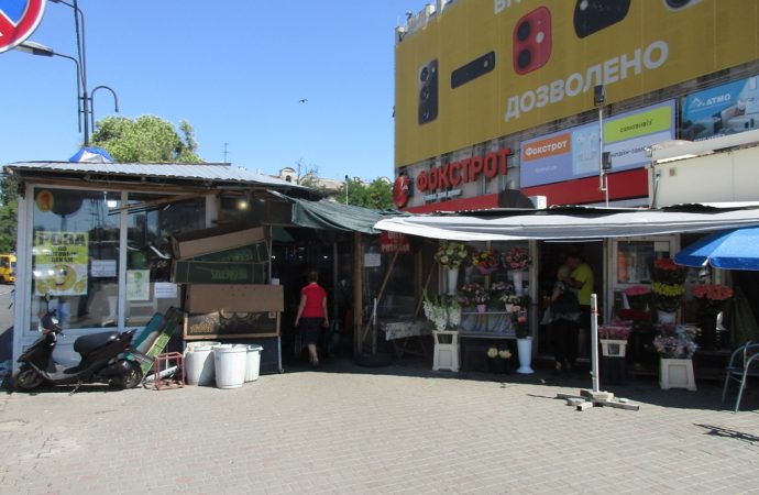Часть ларьков (ближе в Пантелеймоновской) в момент, когда мы фиксировали процесс сноса в первой половине дня, еще продолжала функционировать по назначению. Некоторые цветочники перебрались со своим товаром выше по ступенькам — к ТЦ «Остров», частично цветами торгуют ближе к молочному корпусу.