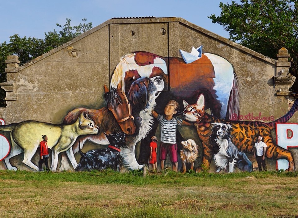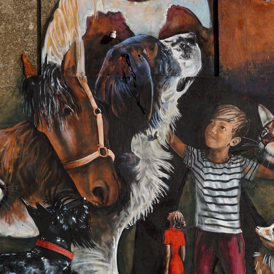 Новый мурал художница написала на стене приют для животных «Берсерк» на Жеваховой горе. Этот приют спасает и выхаживает животных, которые пережили насилие.