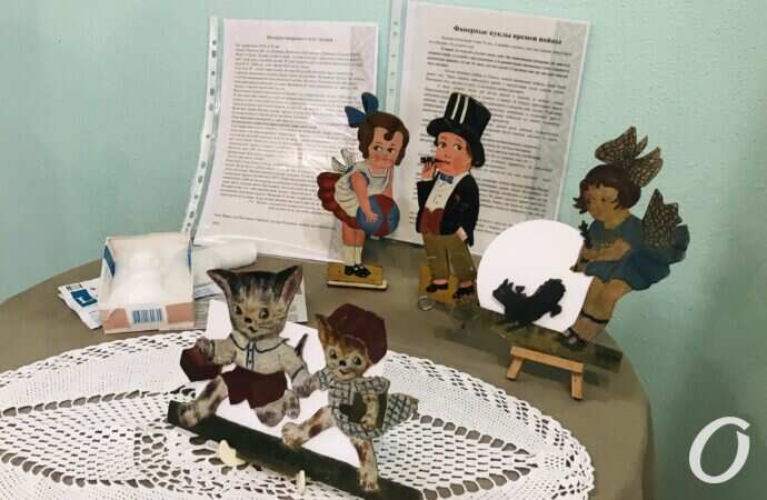 Каждую куклу можно долго рассматривать и сравнивать. Помимо тряпичных, тут есть экспонаты созданные из тыквы, кукурузы, теста и дерева. На каждом столе я- сопроводительные материалы и QR коды, которые при наведении смартфона переведут вас на сайты с дополнительной информацией. Практически о каждом экспонате Инна может долго и интересно рассказывать. Например, о нескольких необычных куклах из дерева. Им около 80 лет. Их во время оккупации сделал одесский подросток. Однажды он нашёл где то на море немецкие открытки. Увидев их он решил сделать из них кукол – перерисовал на фанерку, вырезал и раскрасил фигурки. Получилось красиво. Мать вынесла их на базар на продажу. Дело пошло. Благодаря этому семья выживала.