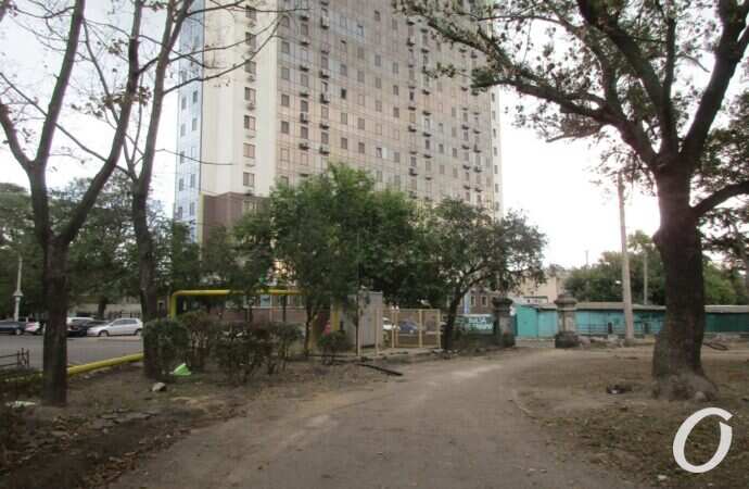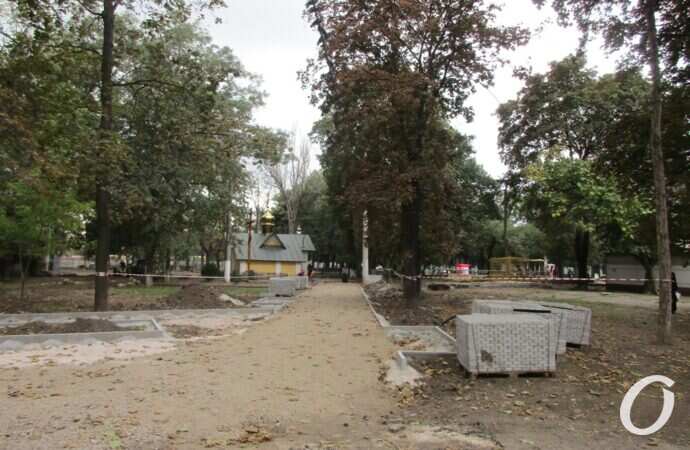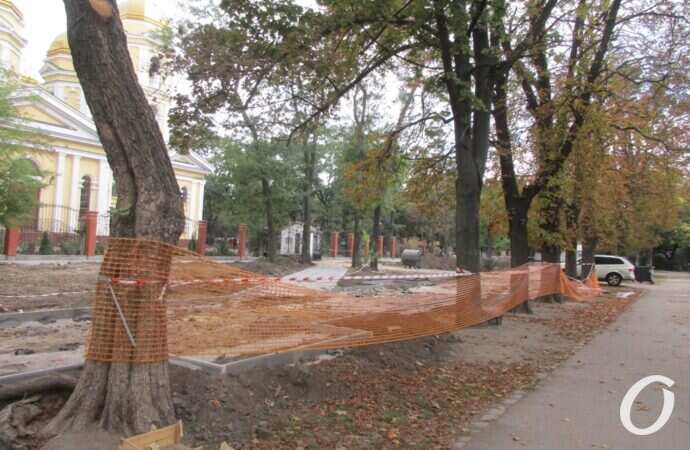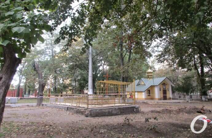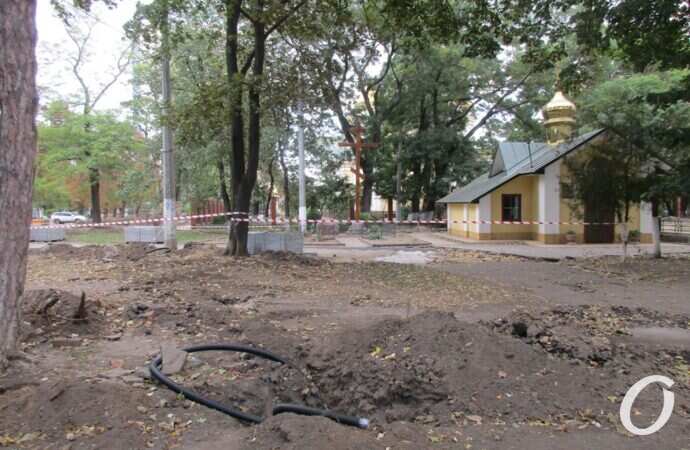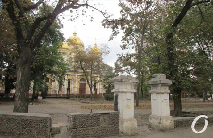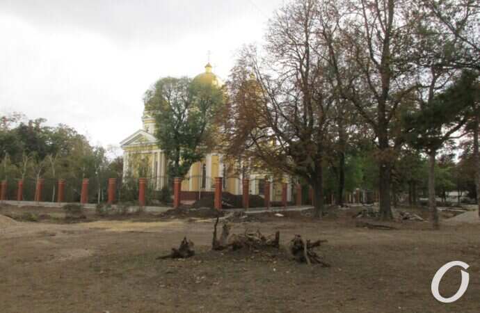 Что в сквере на сегодняшний день? Исчезла старая одесская детская площадка, здесь уже нет и скамеек. На сегодняшний день получилась пустынная площадь с храмом посередине, вся в оградительных лентах и с «кучками» стройматериалов в разных местах.
