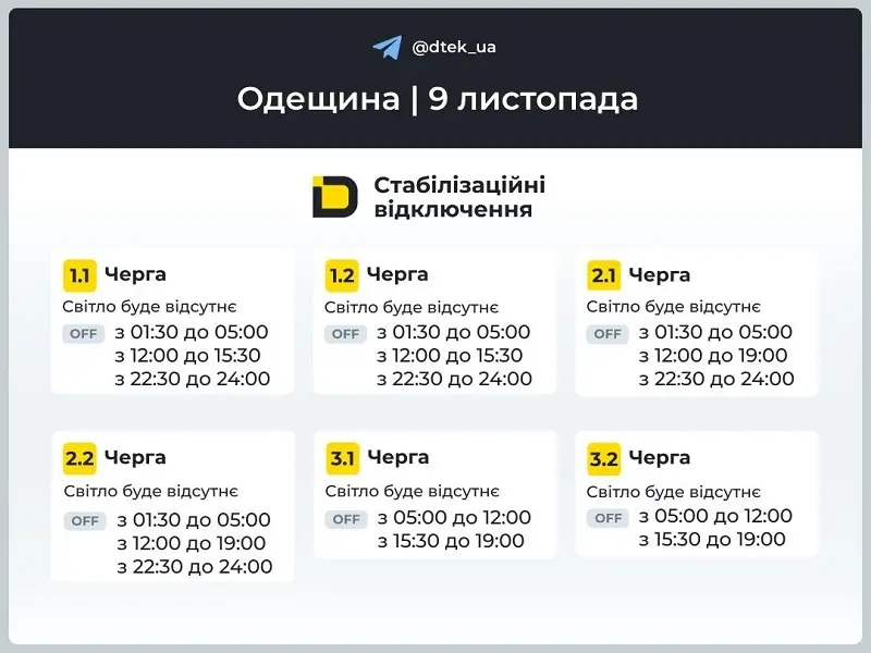 А компания ДТЭК обнародовала графики стабилизационных отключений для Одессы и Одесской области: