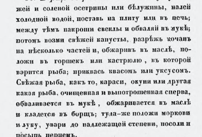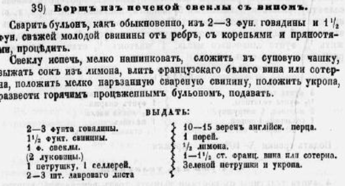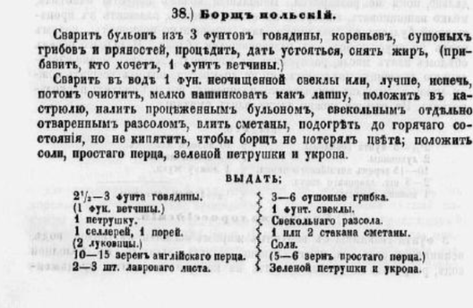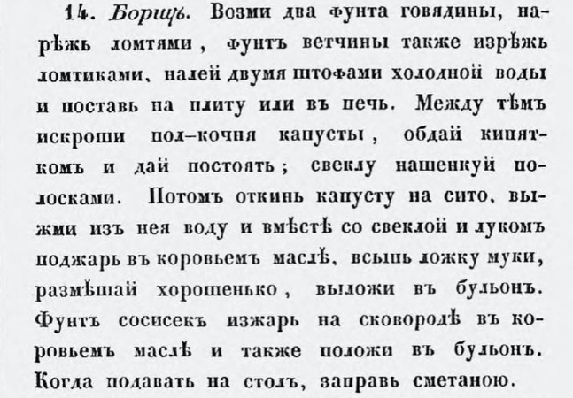 Елена Молоховец, пожалуй, самый издаваемый как в дореволюционное, так и в наше время автор. И борщи в ее кулинарных книгах претерпевали изменения. Так, например, в издании 1868 года она дает рецепты борща малороссийского, борща польского, борща с селерой, борща с ушками, борща из карасей, борща из печеной свеклы с вином, борща с селедкой — 7 вариантов! В 1909-м их тоже семь, но некоторые виды она заменит. Например, вместо борща с селедкой появится борщ со свежими грибами.
