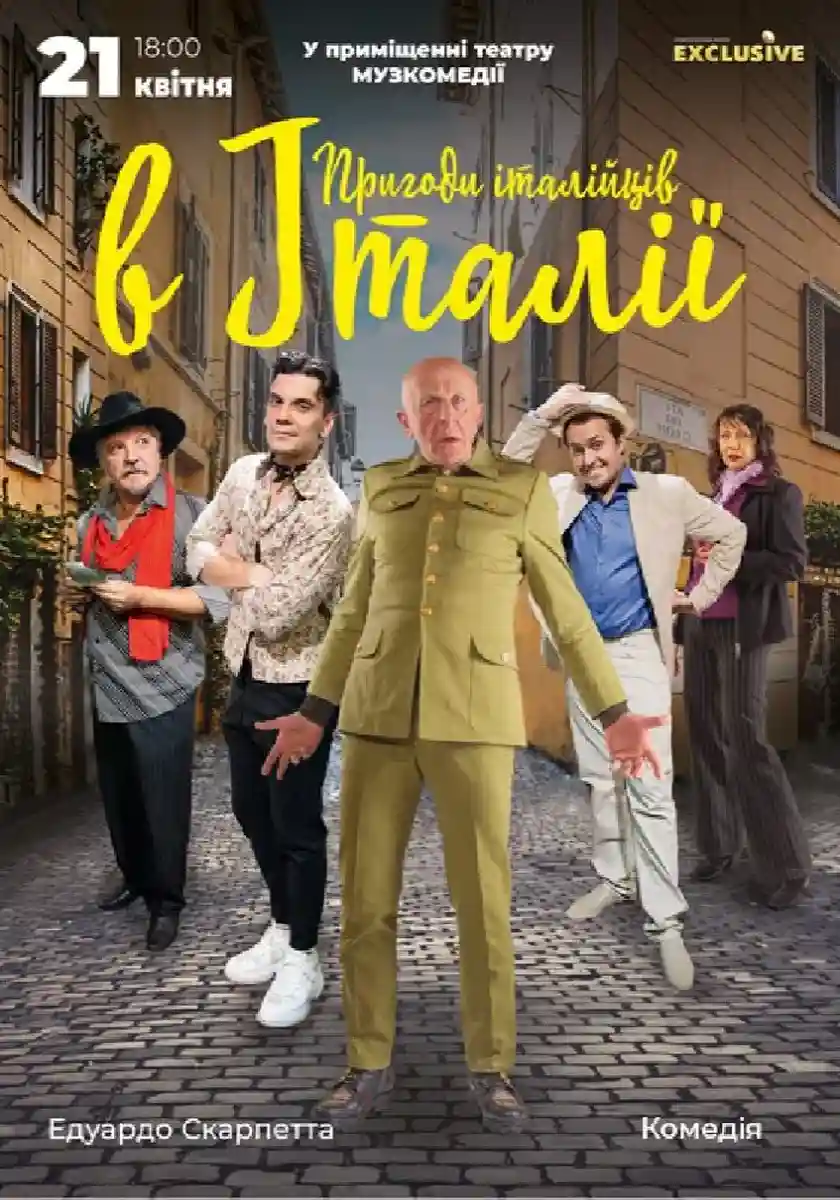 Головокружительная итальянская комедия, которая заставит смеяться до слез! Неудержимый юмор, каскад абсурдных ситуаций и блестящая игра звезд украинского театра и кино — все это в постановке «Приключения итальянцев в Италии»!