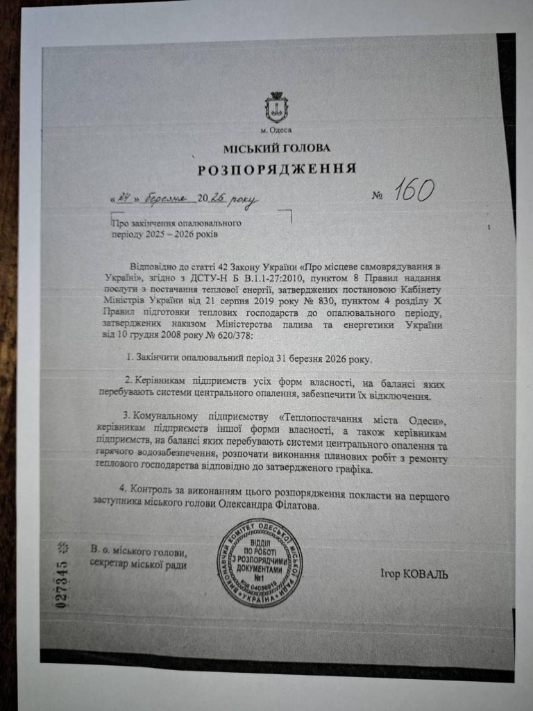 Отопительный сезон в Одессе официально завершится 31 марта. Об этом стало известно из распоряжения и. городского головы Игоря Коваля.