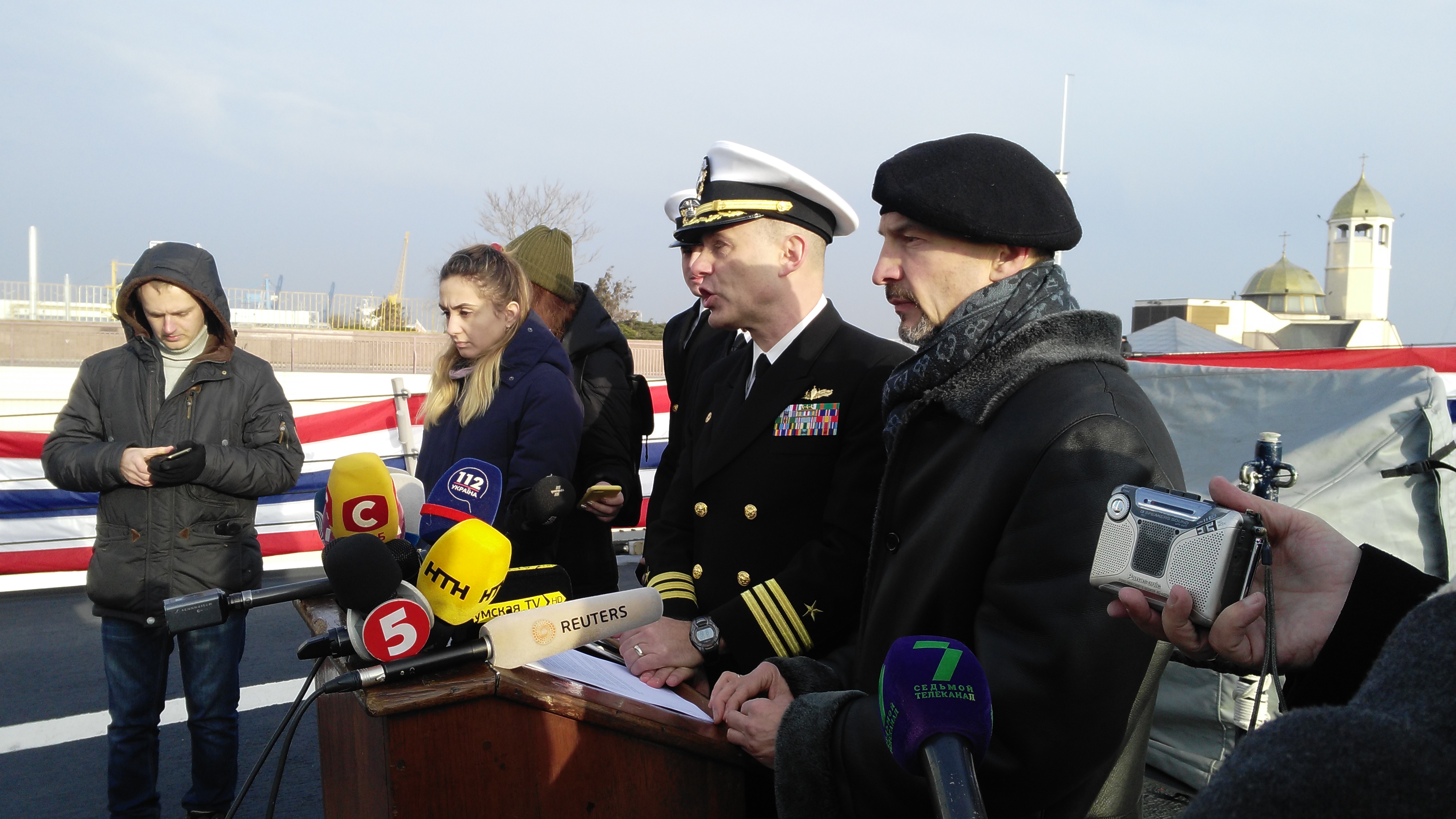 Он назначил встречу журналистам у борта пришвартовавшегося ранее в одесском порту американского ракетного эсминца. Вместе с ним на брифинг прибыли посол США в Украине Мари Йованович, посол США в ЕС Гордон Сондленд, гражданский советник Объединенного командования ВС США в Европе Филип Рикер, заместитель генерального секретаря Евросоюза Жан-Кристоф Бильярд, представители ЕС из Румынии и Польши.