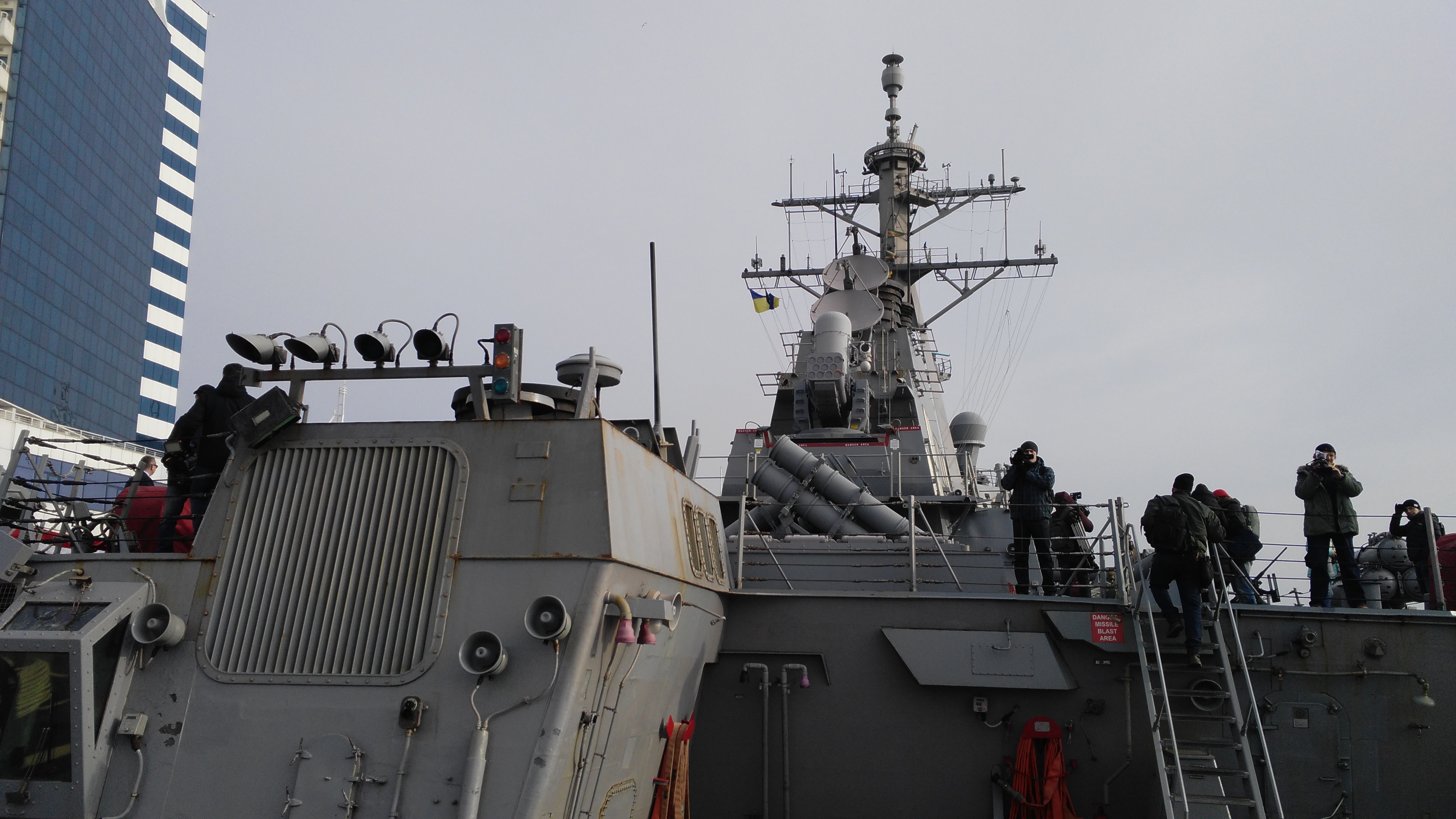 Также для журналистов устроили экскурсию по эсминцу «Дональд Кук». С приветственным словом на борту журналистов встретил капитан Метью Пауэлл, предки которого, как оказалось, родом из Украины. А пресс-офицер Брайен Шмид рассказал о вооружении и возможностях корабля. Эсминец был спущен на воду в 1998 году. Эскадренный миноносец ВМС США четвёртого поколения вооружен крылатыми ракетами «Томагавк» с дальностью полёта до 2500 километров, способными нести ядерные заряды. Кроме того он имеет противокорабельные и противолодочные орудия, а также оборудован вертолетной площадкой, которая может принимать небольшие вертолеты. Команда корабля — 300 человек, в том числе женщины.