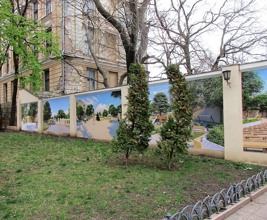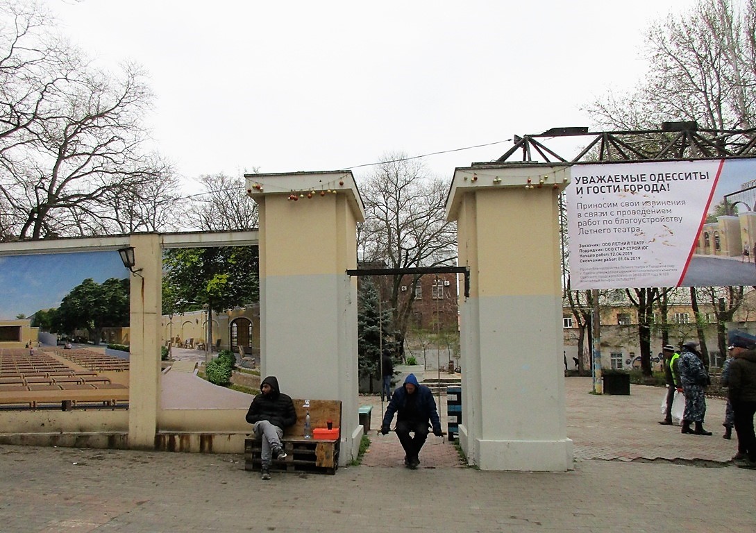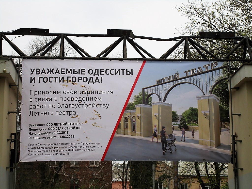 Плакат у входа в Летний извещает, что здесь начались работы по благоустройству, а общая с Летним стена в Горсаду увешена бордами с визуализацией того, как будет выглядеть в будущем Летний театр.