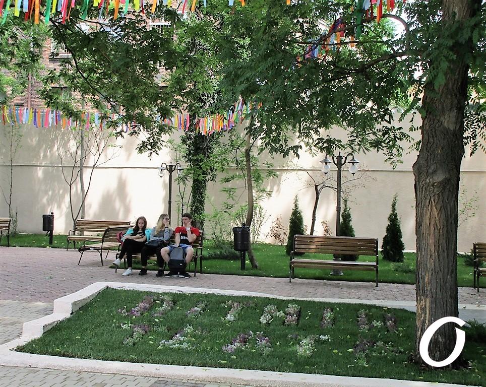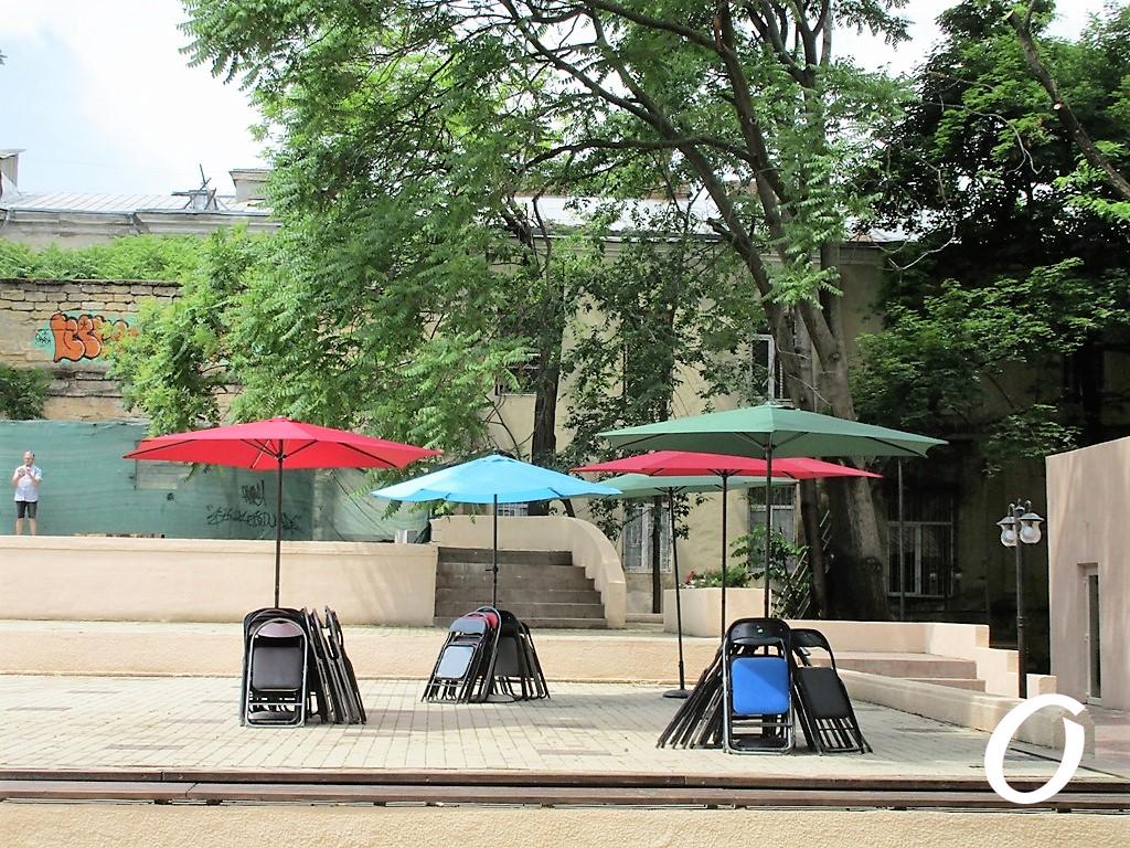 Проход открыт. Плитка новехонькая, скамейки удобные, со спинками, но их мало. Очень не хватает деревьев и зелени. Стоят зонтики, рядом с ними — раскладные стулья. Люди себе отдыхают, мой вопрос: «И как вам?» вызывает ленивый ответ: «Нормально». Кто-то откровенно признается: «Надоели все эти терки».