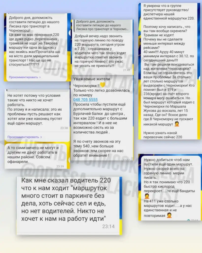В обращении жители просят администрацию повлиять на перевозчика и расписание: уменьшить интервал движения маршрутки №220 хотя бы до 10 минут в часы пик. Также они предлагают запустить дополнительный маршрут, который поможет разгрузить №220 и улучшит связь района с другими частями Одессы.