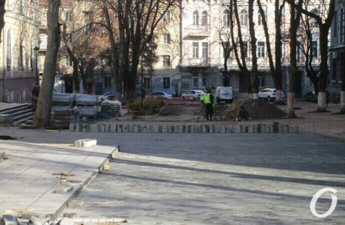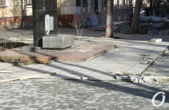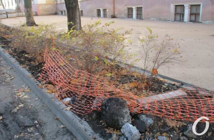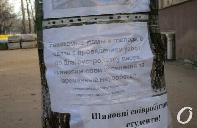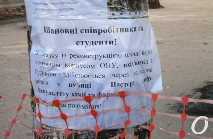 Участок, где ведутся работы, огражден специальной сеткой, кое-где уже виднеется новая плитка. Пройти (но не проехать) здесь можно, но, как следует из вывешенных объявлений, попасть в главное здание ОНУ сейчас можно лишь с улица Пастера (двор факультета химии).