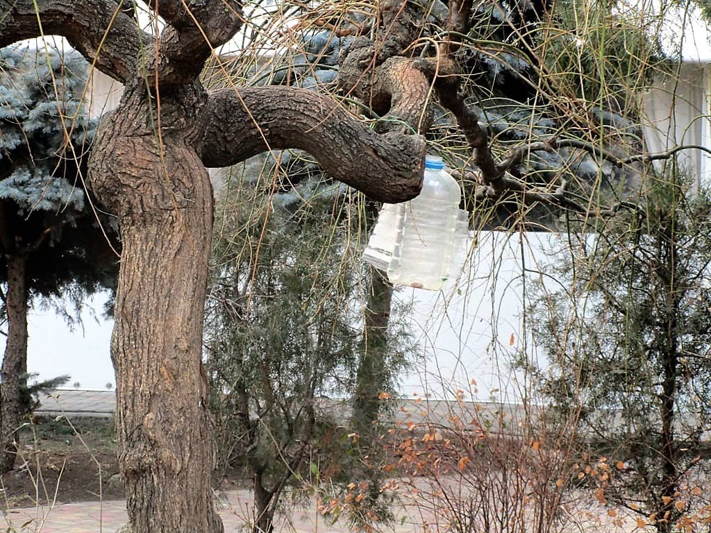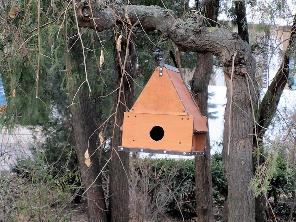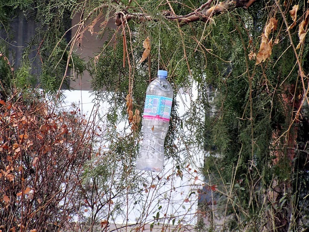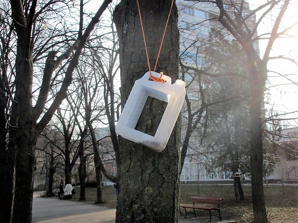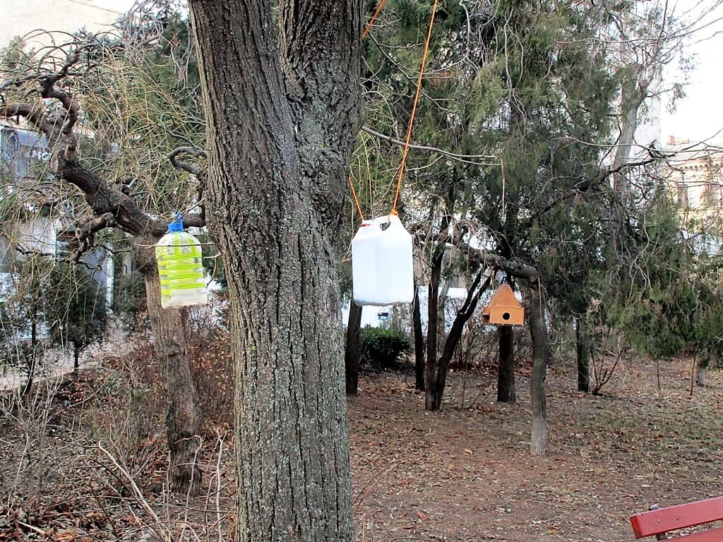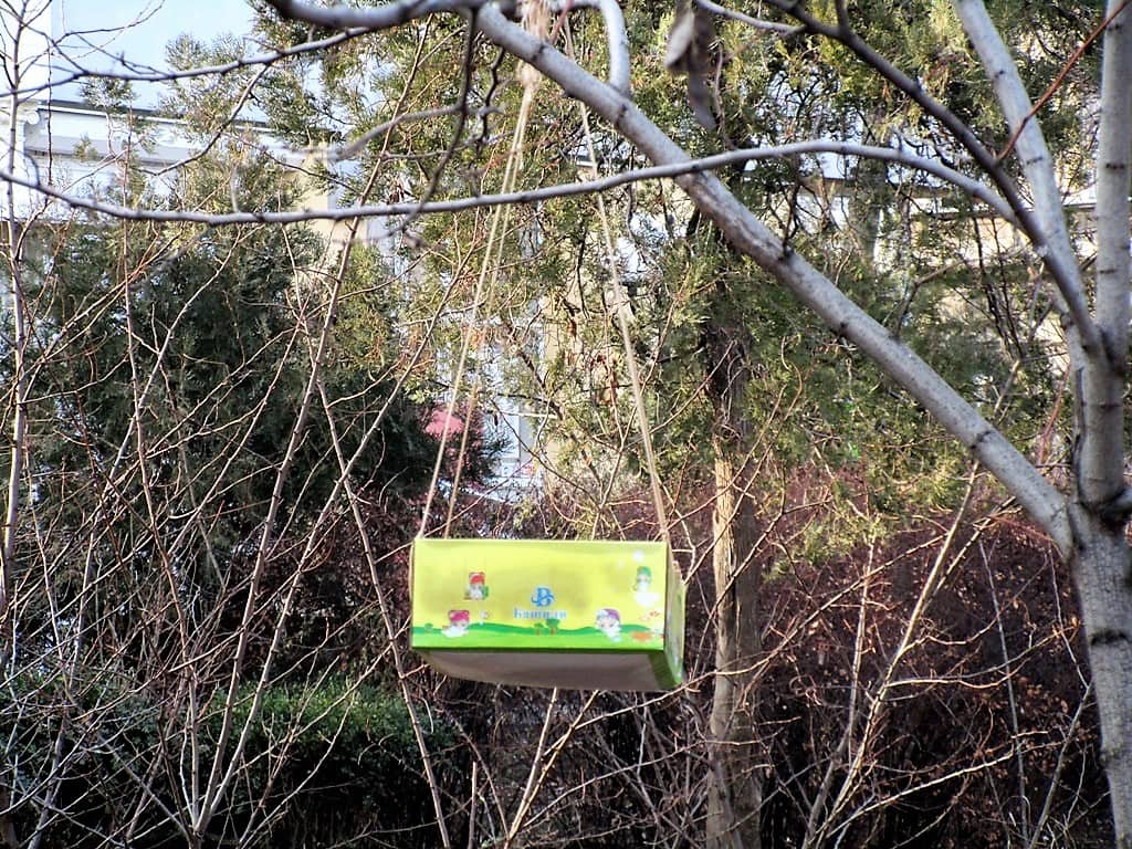 Разнообразие птичьих столовых и их количество поражает. В ход пошло все: пластиковые бутылки и бутыли, коробки от тортов и детских игрушечных наборов. Появились здесь и деревянные скворечники — в виде полочек, избушек и домиков.