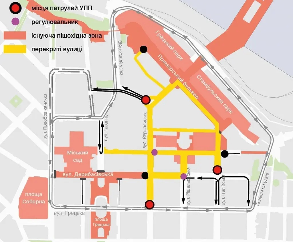 Так, с 13:30 и до завершения мероприятия будет временно ограничено движение автотранспорта по следующему маршруту: ул. Ланжероновская (центральный вход в Одесский национальный академический театр оперы и балета) – ул. Ришельевская – ул. Дерибасовская – ул. Европейская – Европейская площадь – Приморский бульвар (памятник Дюку де Ришелье) – административное здание Одесского городского совета (Биржевая площадь, 1) – ул. Ланжероновская.