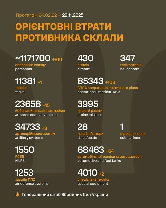 Потери российских захватчиков за минувшие сутки составили 910 человек. Также украинские воины обезвредили танк, 15 боевых бронированных машин, три артиллерийских системы, 106 беспилотников, 64 единицы автомобильной и две единицы специальной техники оккупантов.