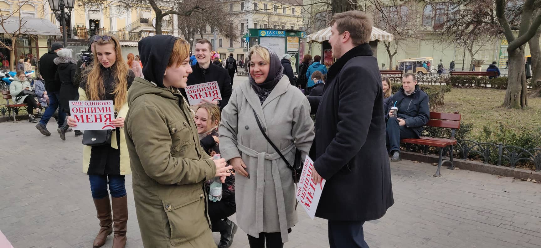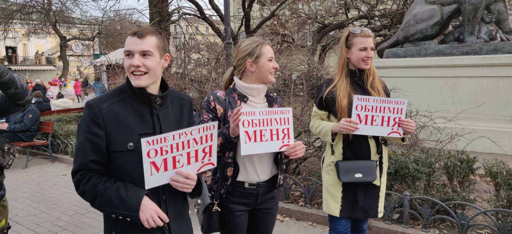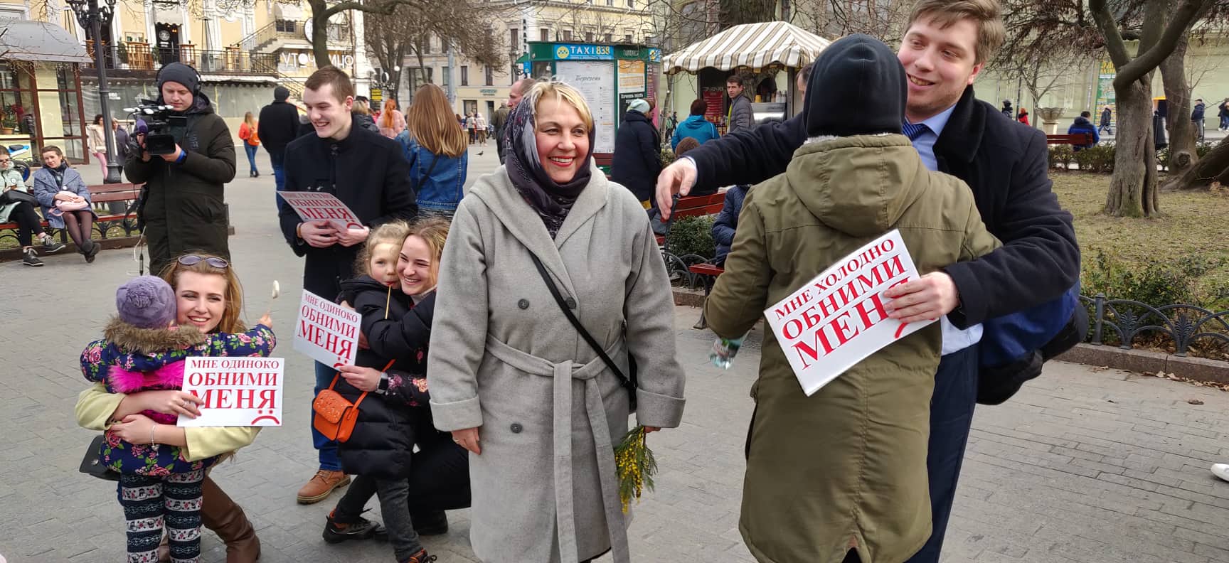 «Обними меня. Мне грустно. Мне одиноко. Мне холодно». Под таким девизом в Одессе, в Городском саду на Дерибасовской, сегодня устроили обнимашки. Приурочили раздачу объятий и цветов к Международному женскому дню. Таким образом молодые люди из молодежной организации «ЛАЙТ» хотели еще раз напомнить всем, что тепла много не бывает и каждый человек в нем нуждается, даже когда его дарят незнакомцы.