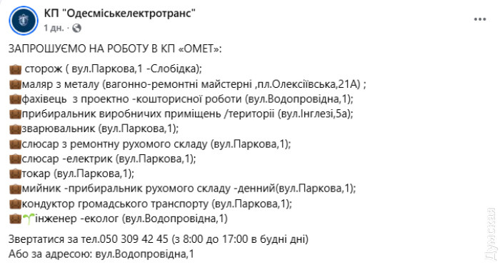 Весьма интересное объявление появилось в соцсетях КП «Одесгорэлектротранс», в котором говорится о поиске ряда работников. Из списка открытых вакансий видно, что предприятию не хватает специалистов всех уровней: от слесарей, токарей и сварщиков до инженеров-экологов, кондукторов и уборщиков подвижного состава.