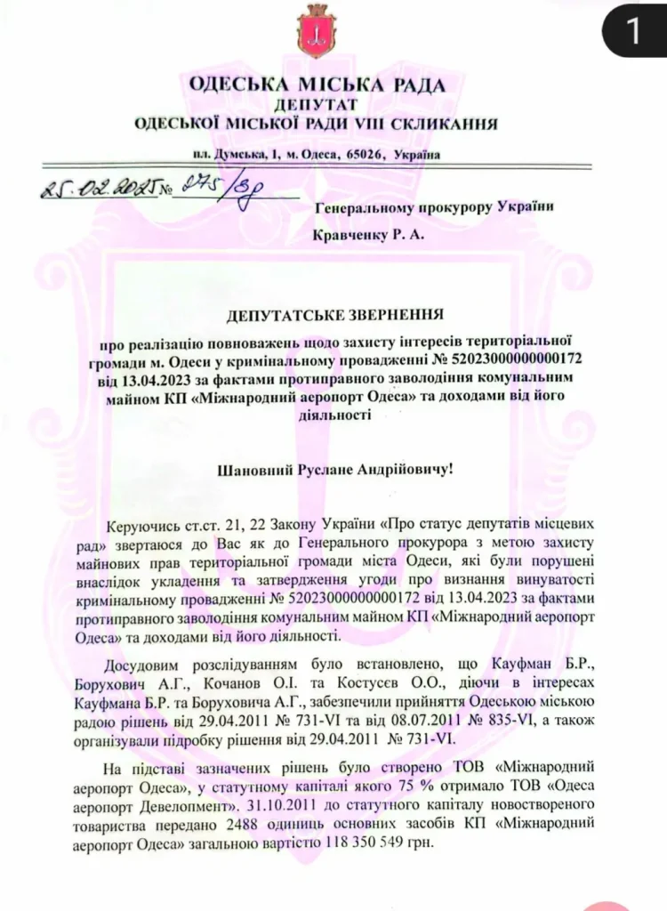 Депутатка Одесского городского совета Ольга Квасницкая назвала соглашение по делу об аэропорте «юридическим абсурдом» и призвала Генпрокурора вмешаться. По ее словам, громада города не давала письменного согласия, как того требует закон.