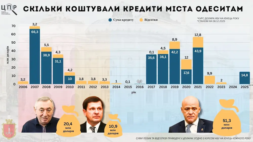 Так, с 2006 по 2010 год Одесса заплатила 144,5 млн грн процентов, с 2011 по 2013 год — 88,3 млн грн. Во время управления городом Геннаддием Трухановым сумма процентов достигла 1 млрд 495 млн грн. В целом за почти два десятилетия город переплатил по кредитам более 1,7 млрд гривен.