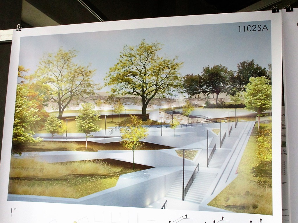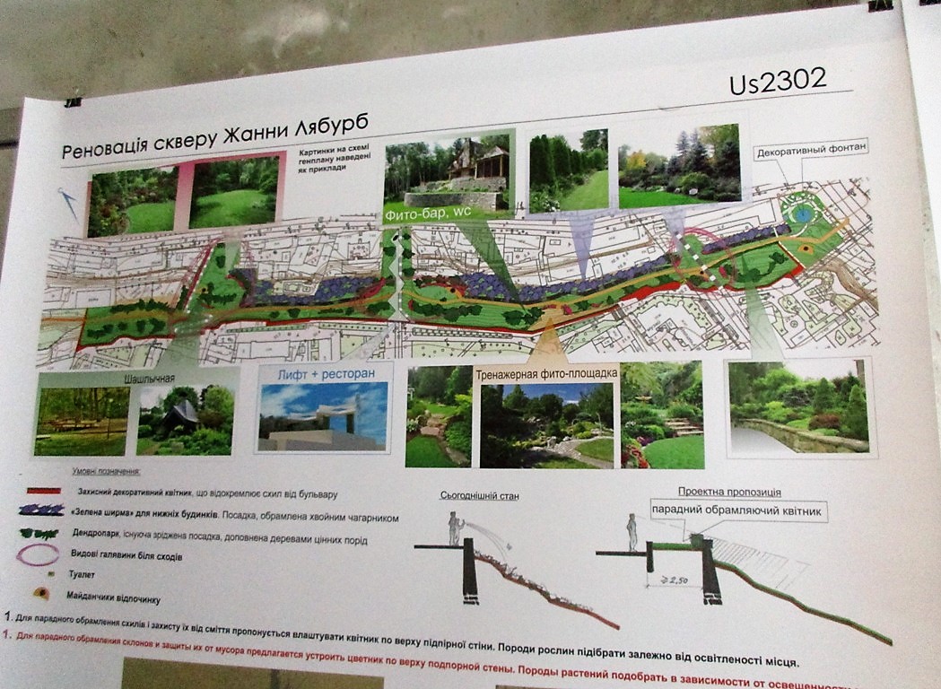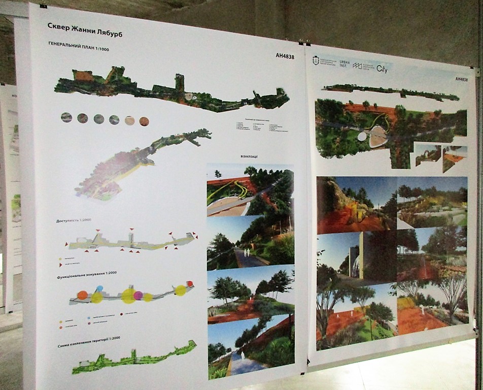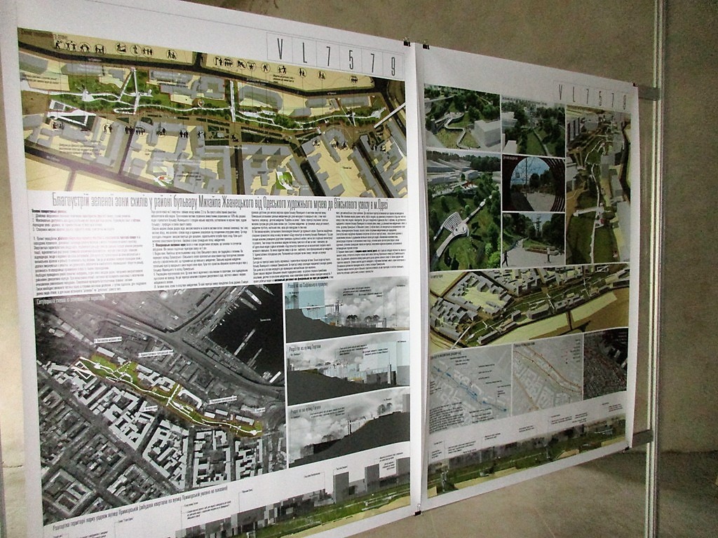 Проекты-участники конкурса выставлены на больших планшетах, каждый сопровождается описанием, чертежами и визуализацией того, какими видели будущее склонов под бульваром Жванецкого.