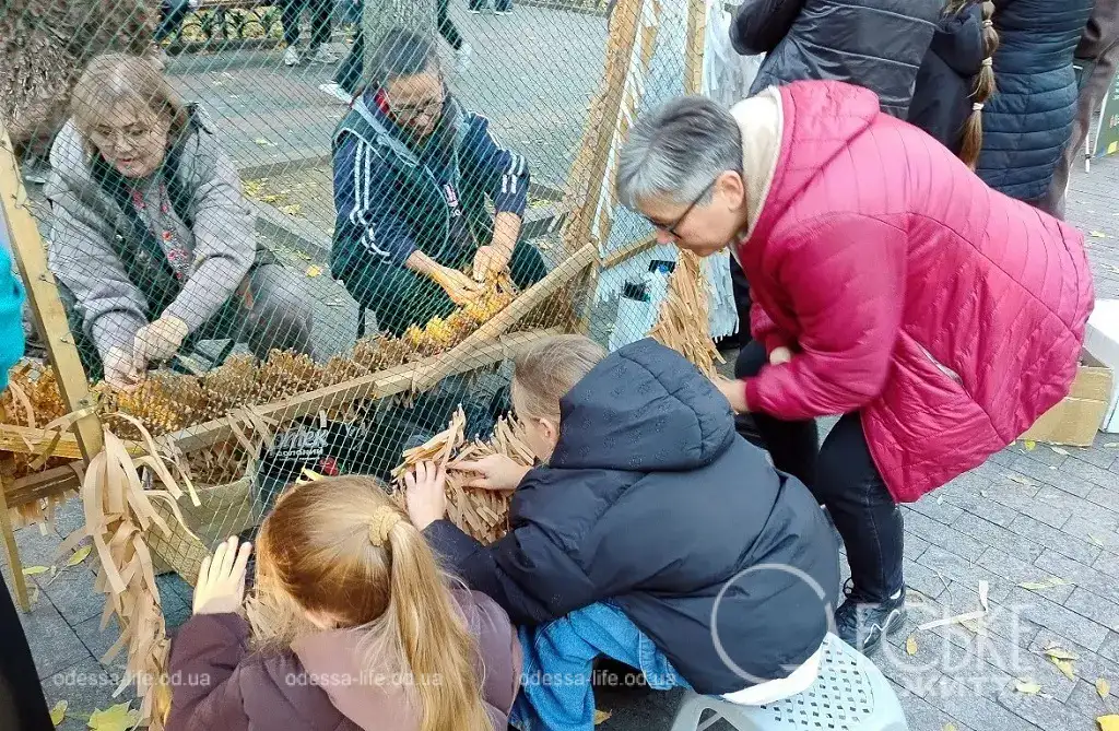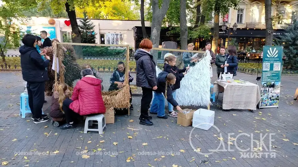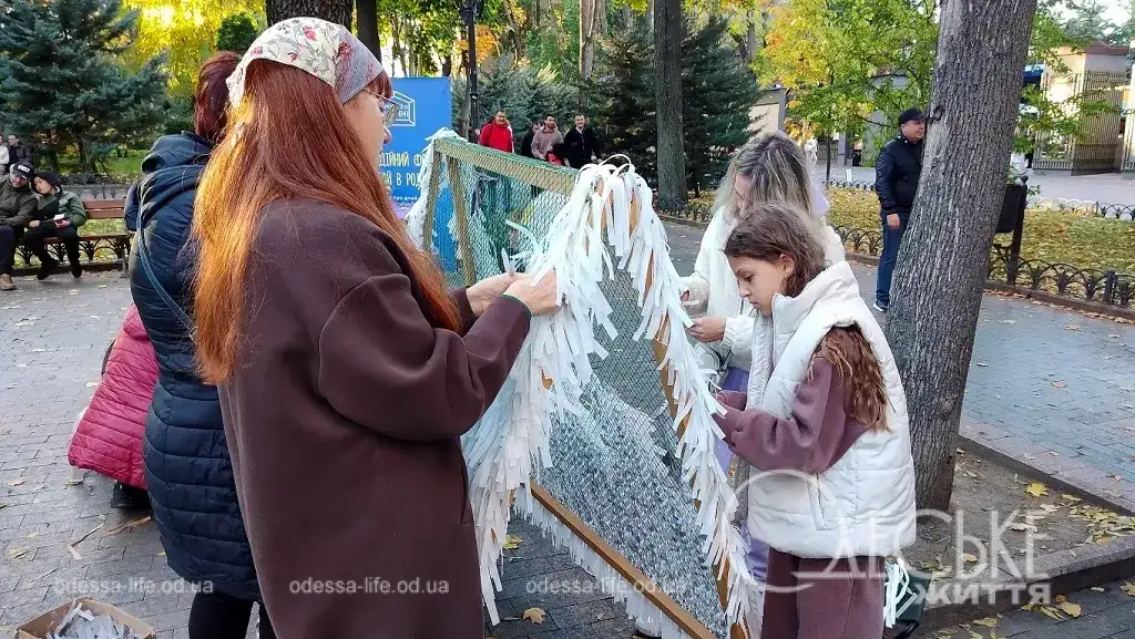 Рядом со сценой не прекращалась работа – волонтеры показывали, как плести защитные сети для военных, и каждый желающий мог присоединиться. Люди сосредоточенно вплетали ленты в сетку, кто-то приносил свои материалы, кто-то учился впервые.