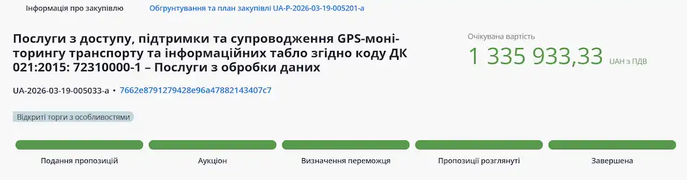 По итогам тендера подрядчиком стала киевская компания «Центральный маршрутизатор». Договор с ней был подписан 17 апреля. Сумма контракта составляет 1,3 млн грн и предусматривает техническое сопровождение системы GPS-мониторинга.