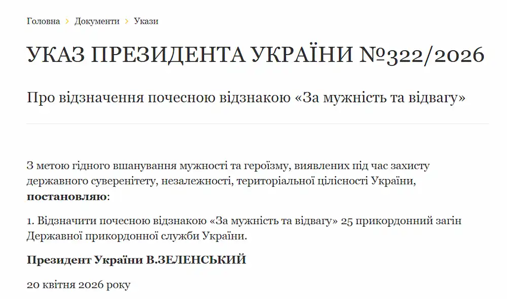 25-й пограничный отряд Государственной пограничной службы Украины отмечен почетным знаком «За мужество и отвагу». Соответствующий указ подписал Президент Украины Владимир Зеленский 20 апреля 2026 года.