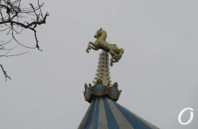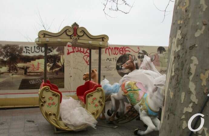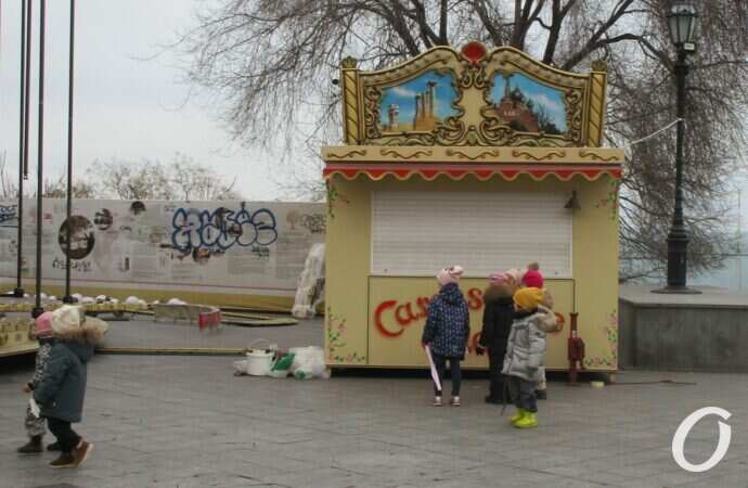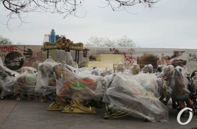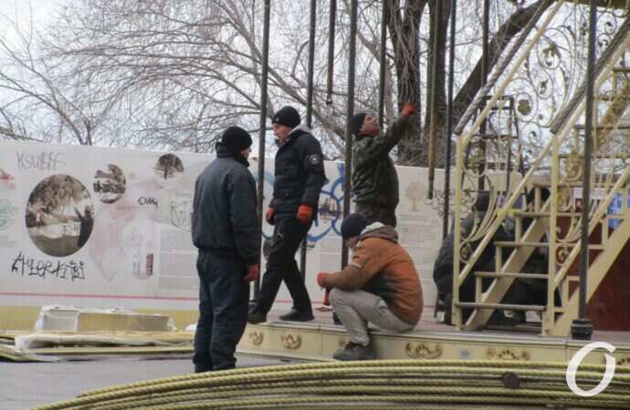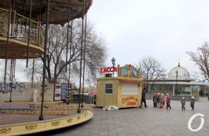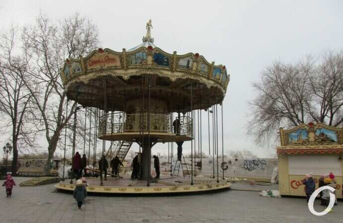 Неподалеку от памятника Дюку устанавливают новогоднюю карусель. Эта карусель становится новогодней и устанавливается на Приморском бульваре уже второй год подряд.