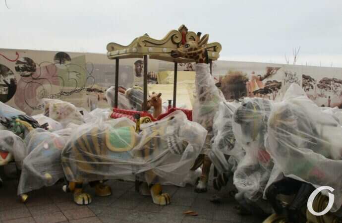 Сиденья-зверушки, сиденья-кареты уложены пока рядом с каруселью. Среди них просматривается и символ наступающего года — Тигр. Работы идут полным ходом.