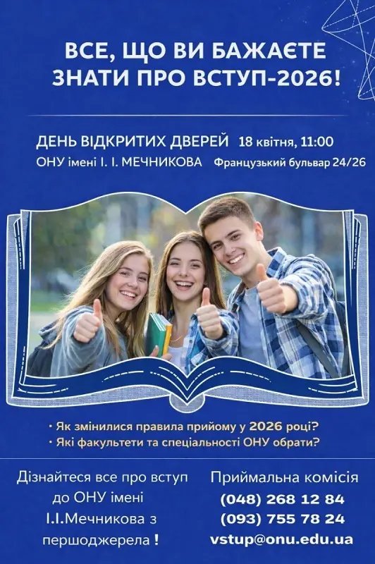 В субботу, 18 апреля 2026 года, один из старейших вузов Одессы – ОНУ им. И.И. Мечникова – откроет свои двери для будущих студентов. Абитуриентов и их родителей приглашают на Французский бульвар, чтобы познакомиться с факультетами и узнать все тонкости вступительной кампании 2026 года.