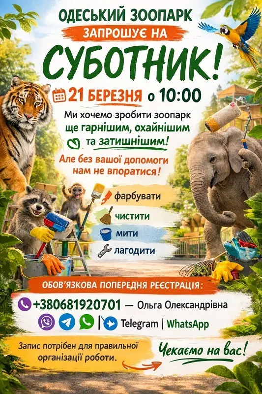 Одесский зоопарк приглашает жителей и гостей города присоединиться к весенней толоке. В субботу, 21 марта, в учреждении пройдет масштабный субботник, цель которого – подготовить территорию к сезону и сделать ее уютнее для посетителей и питомцев.