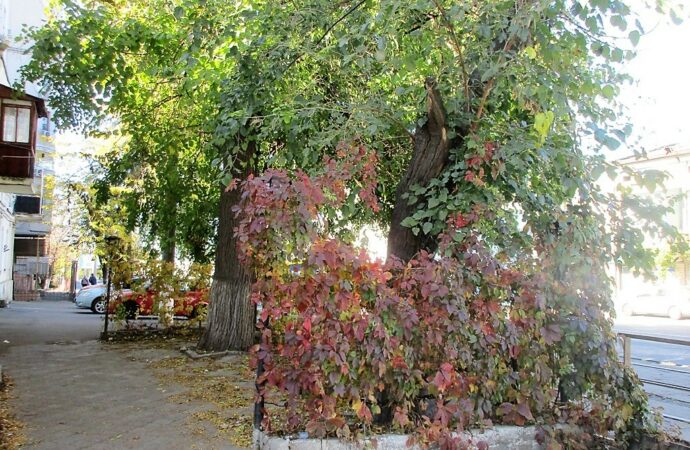 Одно-, двухэжтажные неказистые дома показались красавцами. Ну умеет же осень осенить очарованием! Даже старые столбы, увитые багрецом и золотом, кажутся сказочными.