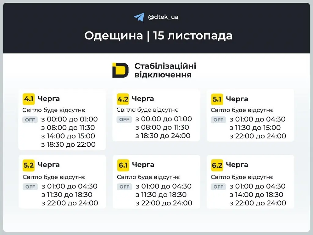 Согласно распоряжению компании «Укрэнерго», завтра, в субботу, 15 ноября 2025 года, в большинстве регионов Украины будут применяться меры по ограничению потребления электроэнергии как следствие массированных российских ракетно-дроновых атак на энергообъекты страны. Стабилизационные отключения света затронут и Одесскую область.