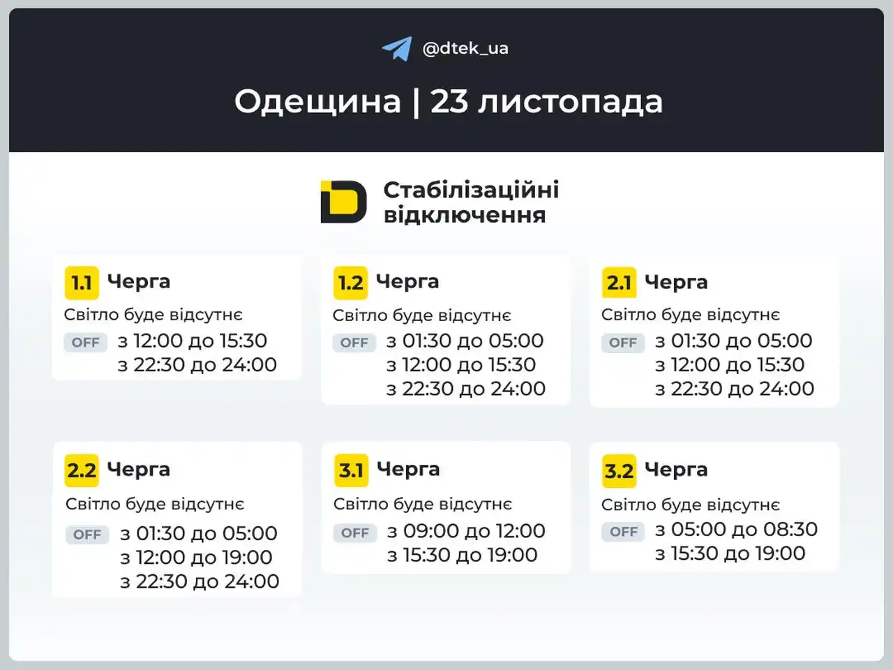 Согласно обновленным данным компании ДТЭК, графики стабилизационных отключений света в Одессе и области 23 ноября будут следующими: