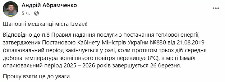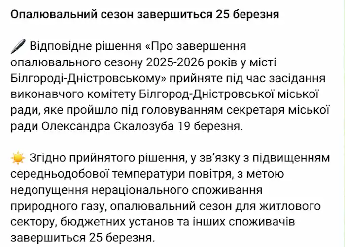 С 26 марта в Измаиле официально завершен отопительный сезон 2025–2026 годов. Соответствующее решение было принято исполкомом городского совета 23 марта.