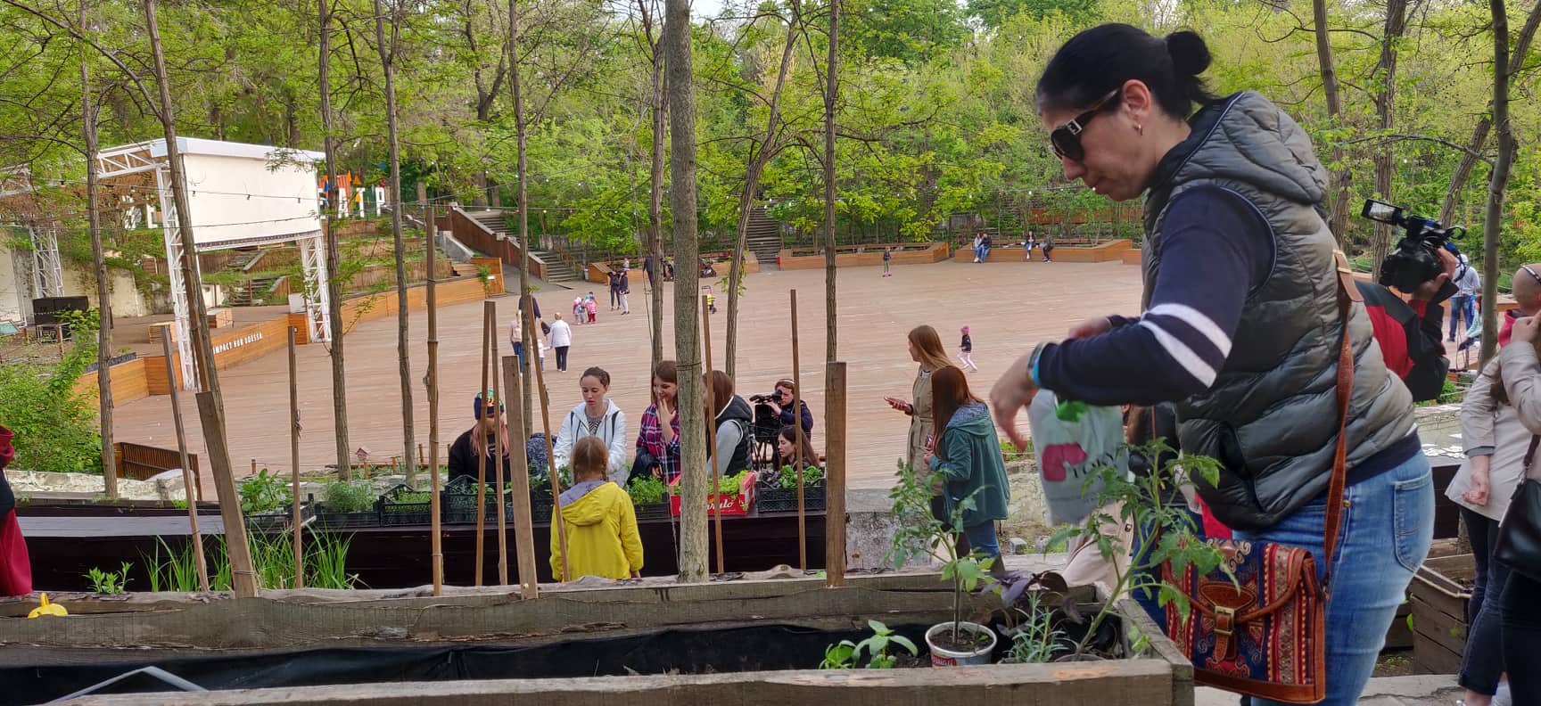 Ранее грядки сажали только на месте прежних скамеек, а сейчас соорудили еще и кадки. Процессом руководит садовник «Зеленого театра» Юлия Байдак — архитектор по образованию. Говорит, больше всего любят садить помидоры и базилик.