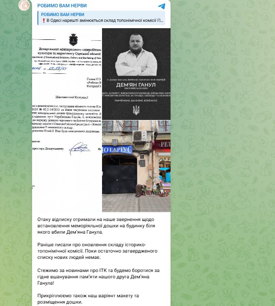 Активисты ОО «Делаем вам нервы» планируют установить памятную доску Демьяну Ганулу на доме в Одессе, где его застрелили. Добавим, что рассмотрение вопроса состоится после обновления историко-топонимической комиссии горсовета. Активисты уже согласовали идею с семьей погибшего. Помимо этого, дизайн доски готов. Установка возможна после всех формальных согласований.