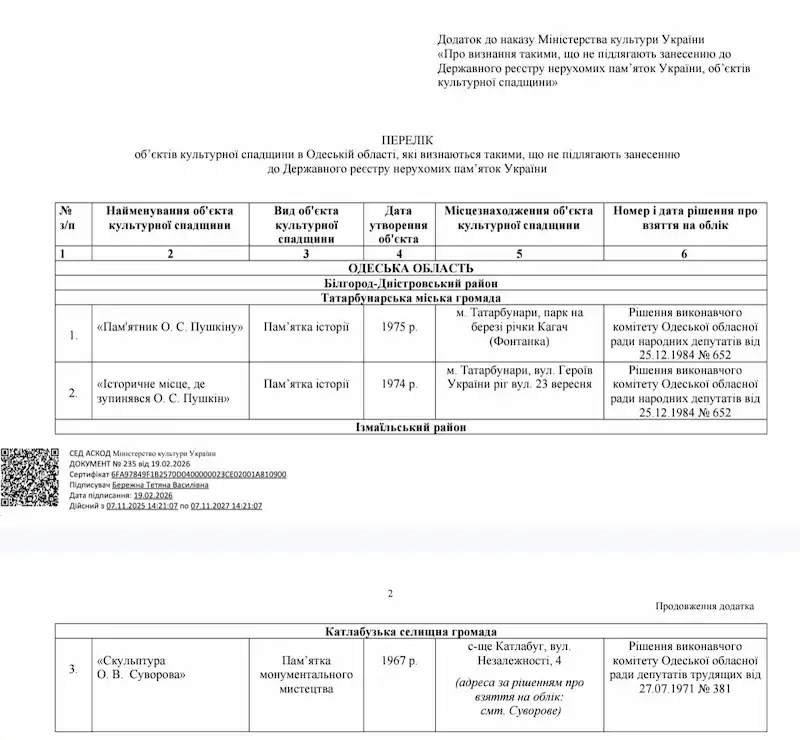 Министерство культуры Украины исключило несколько объектов из Государственного реестра недвижимых памятников. Речь идет о памятниках российским деятелям в Одесской области. Теперь они больше не охраняются государством и могут быть демонтированы по решению местных властей.